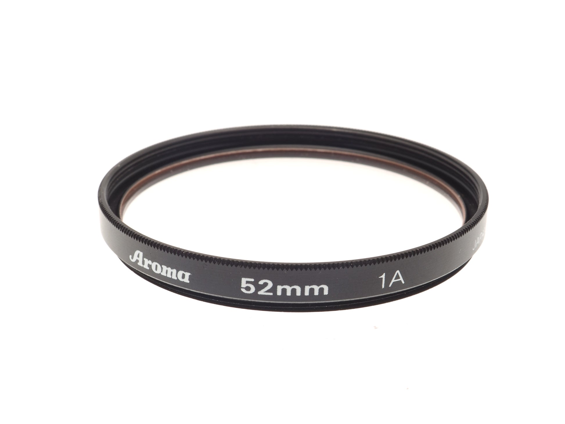 Skylight (light warming) filter made by Aroma for lenses with 52mm filter threads. Black metal construction with knurled edges.