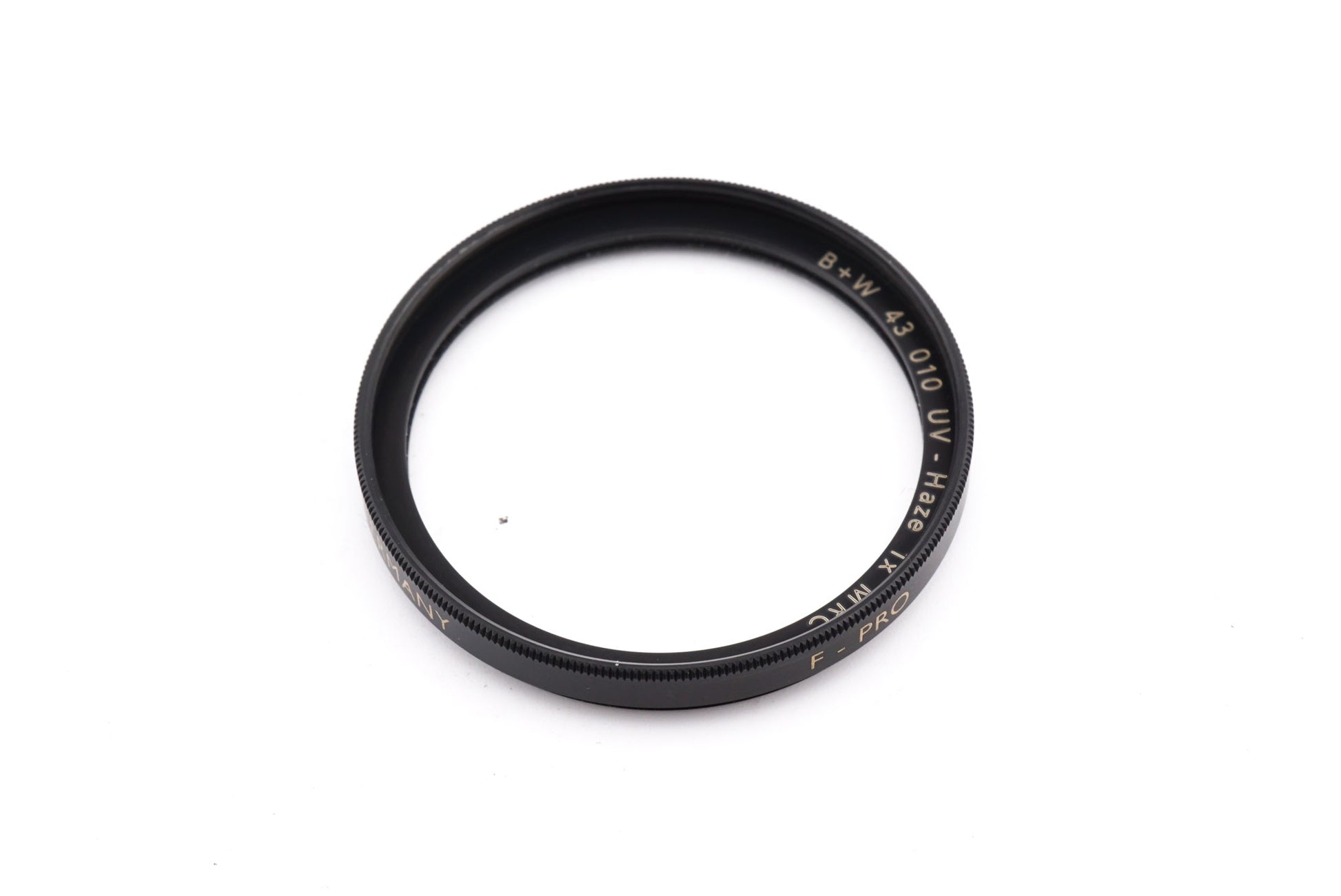 Clear UV / Haze / protective filter from B+W for lenses with 43mm threads. Black metal construction, with knurled edges.