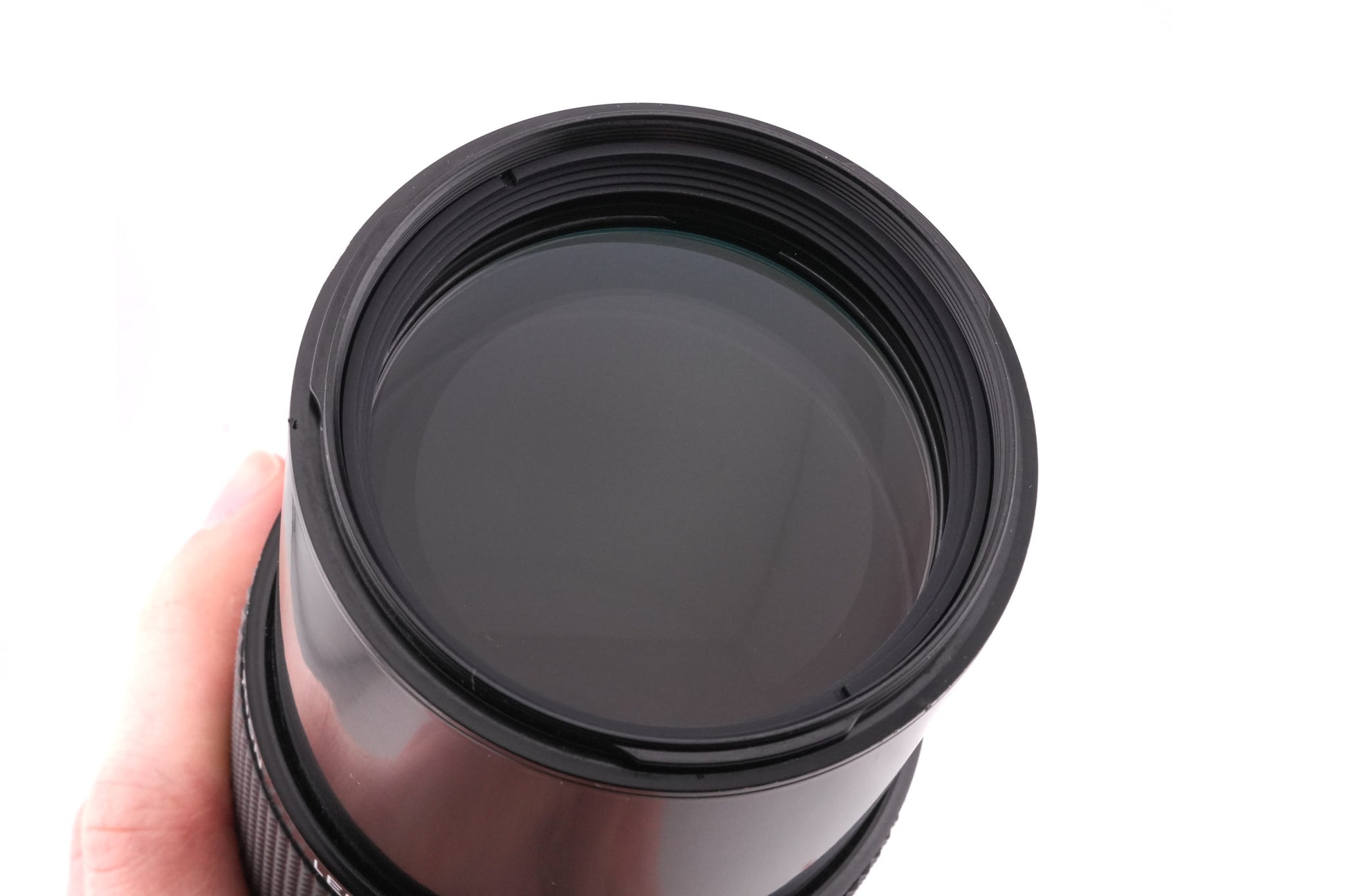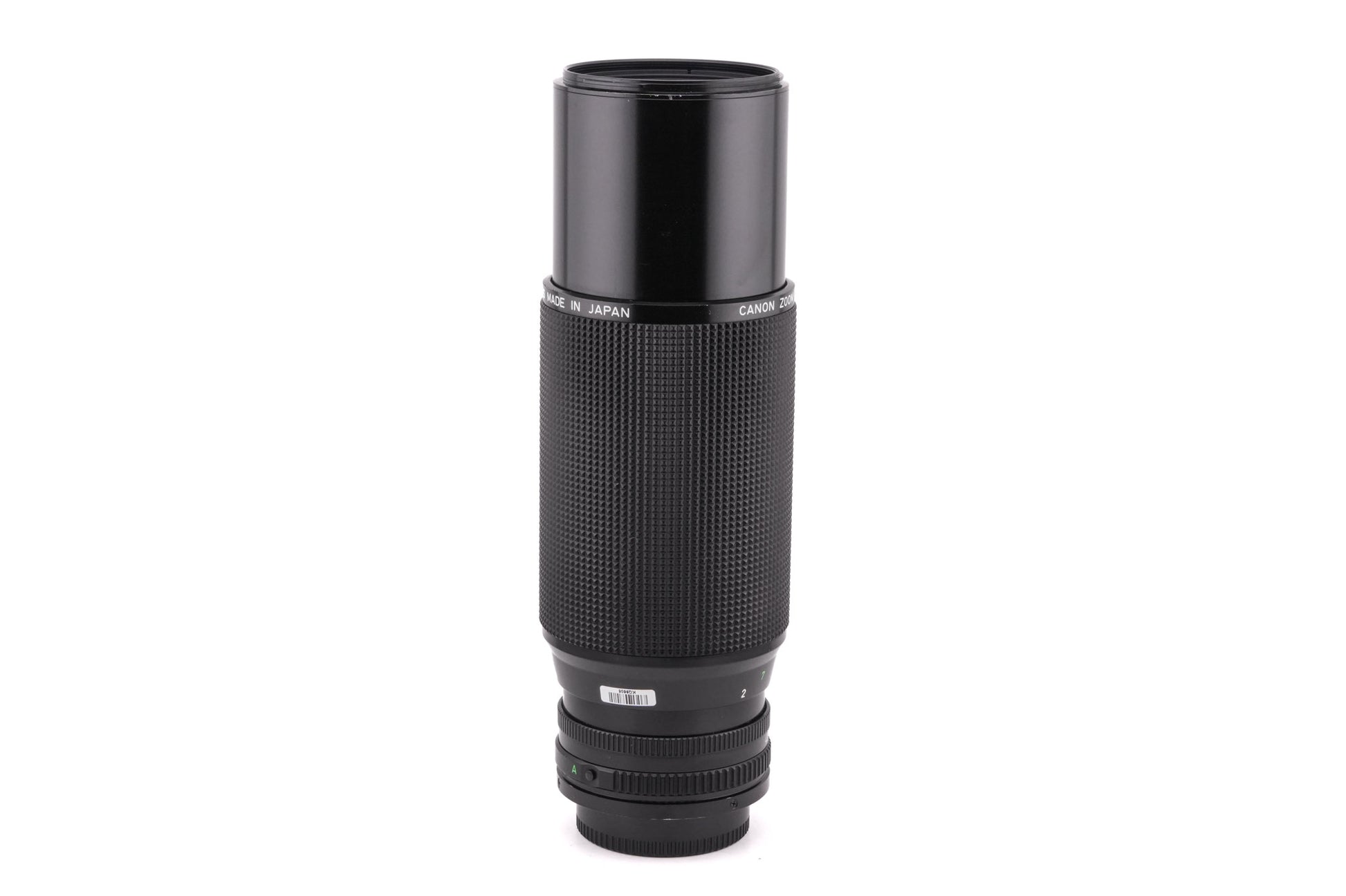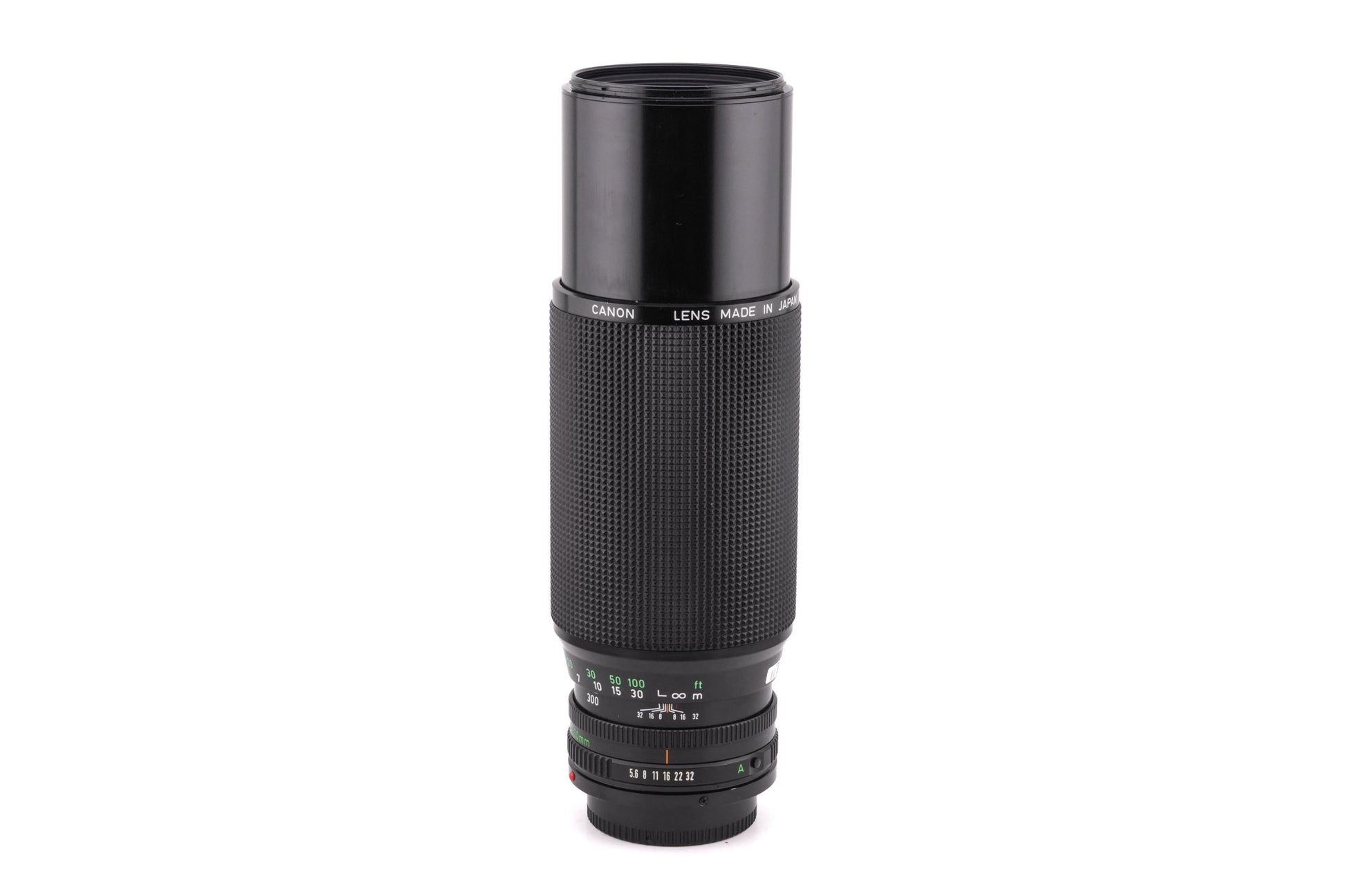 Manual focus push/pull telephoto zoom lens made for FD-mount SLR cameras introduced by Canon in 1980. Uses Canon's newer style FDn locking bayonet. Has in-between aperture stops. Plastic and metal body available in black.