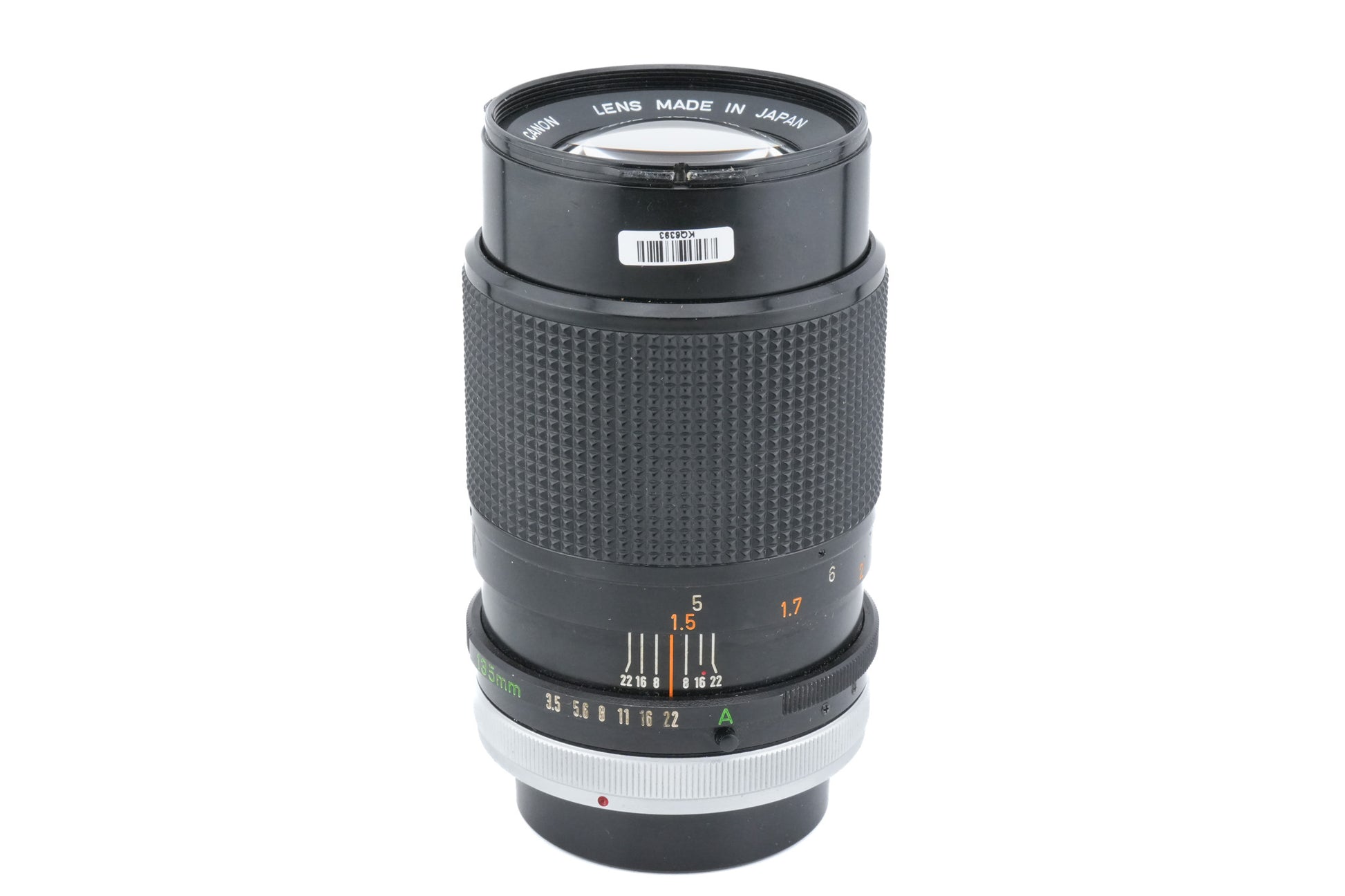 Manual focus telephoto lens made for FD-mount 35mm SLRs by Canon in 1973. The original price (22,900 Yen) is equal to ~395 Euros in 2024. Metal body available in black.