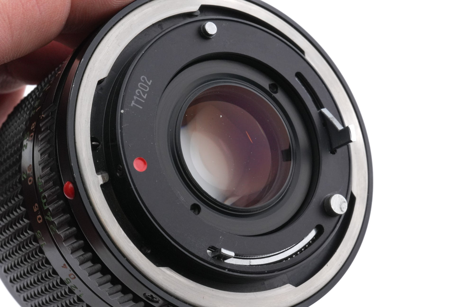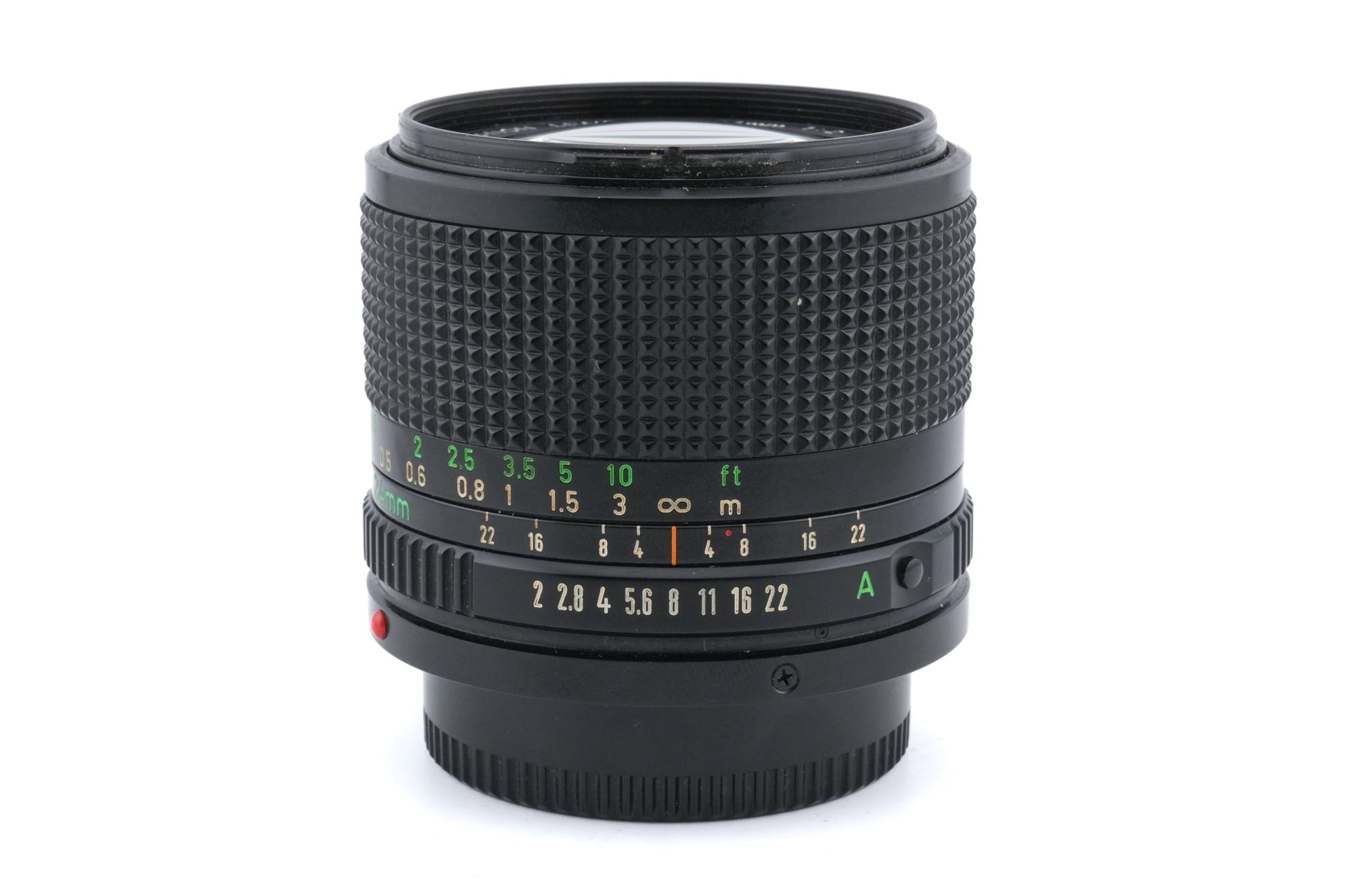 Fast manual focus wide-angle prime lens for the Canon FD mount SLR cameras. Lightweight design. Equipped with floating system to improve the image quality at close range and Super Spectra Coating to eliminate unwanted refelections and improve contrast. Black metal and plastic body.