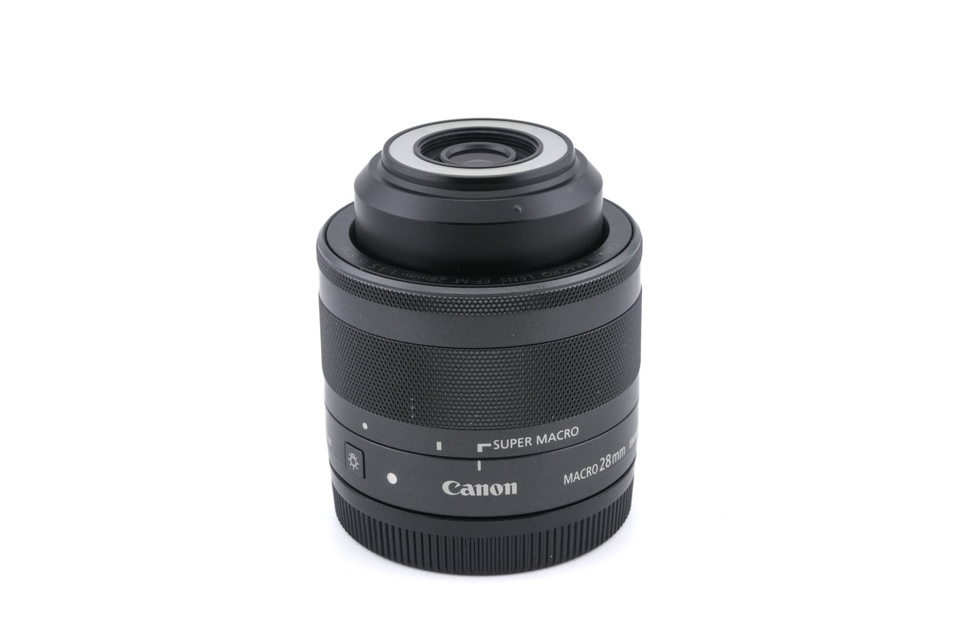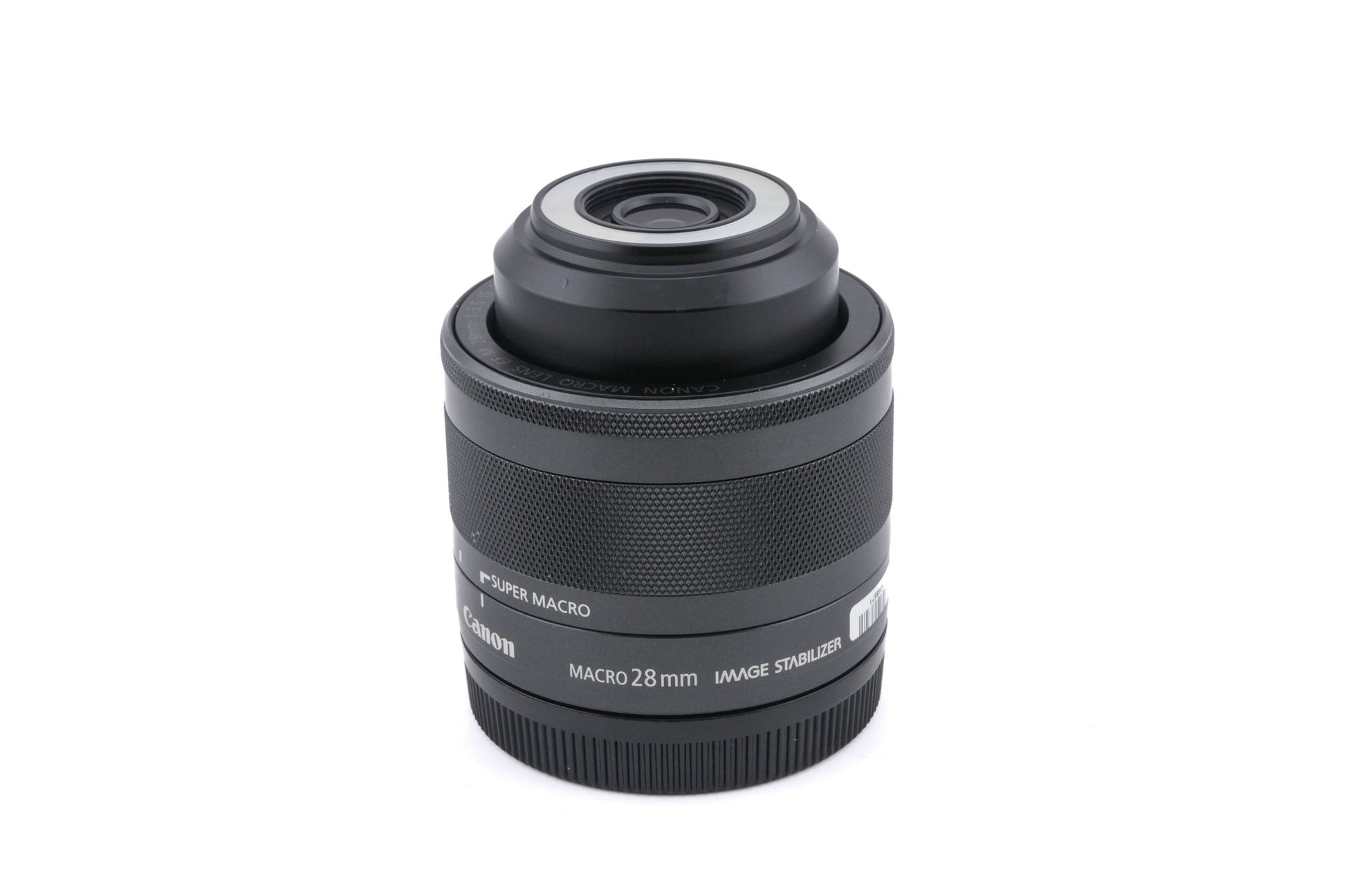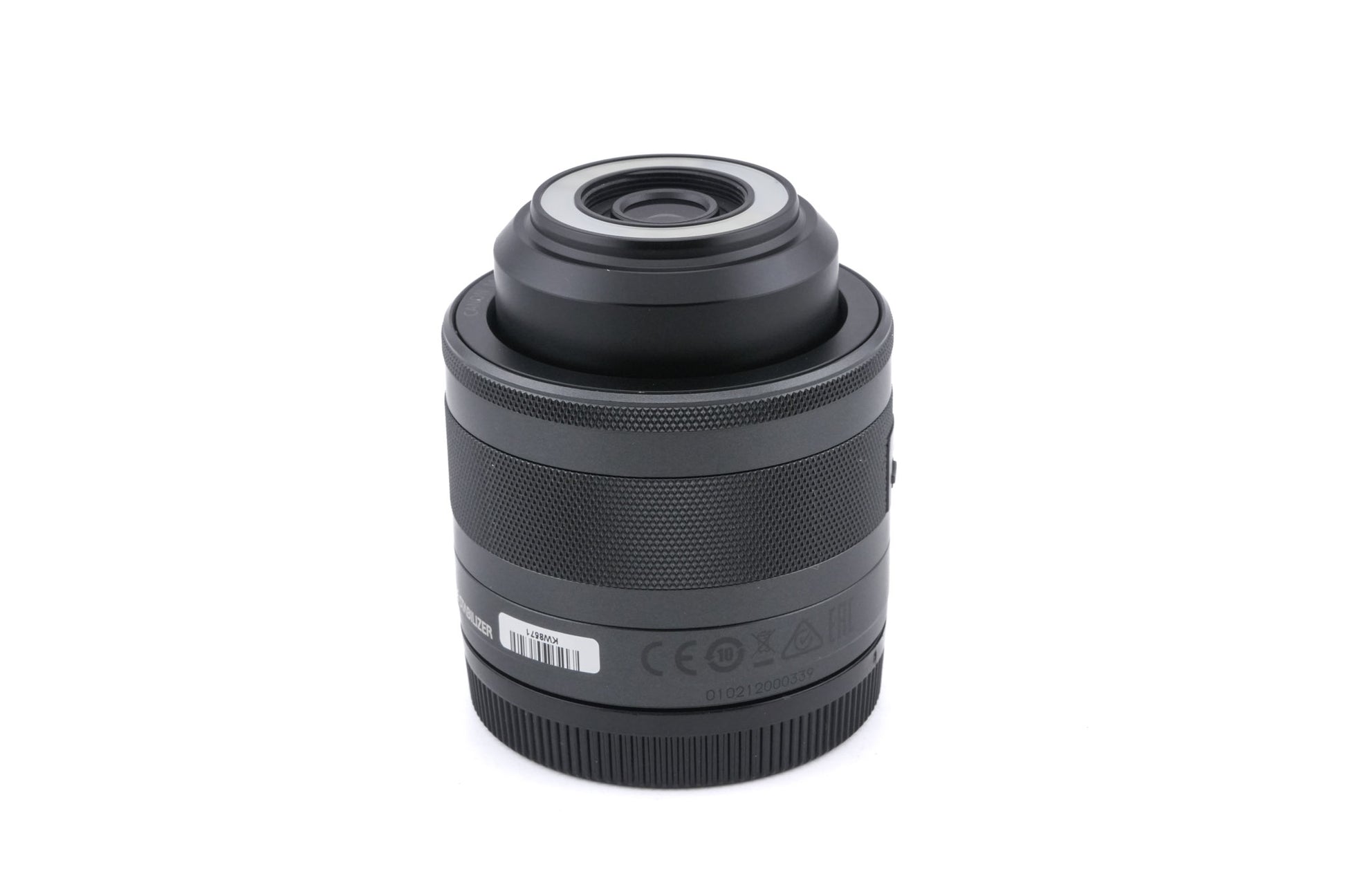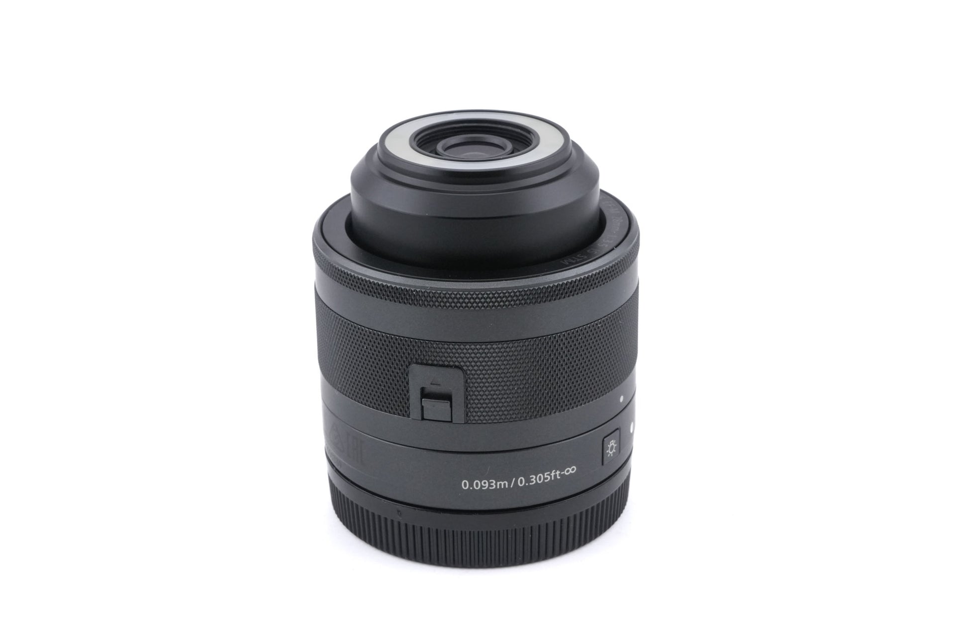 Autofocus macro lens made for EF-M-mount mirrorless digital cameras introduced by Canon. It has a built-in ring light on the front. Plastic body available in black.