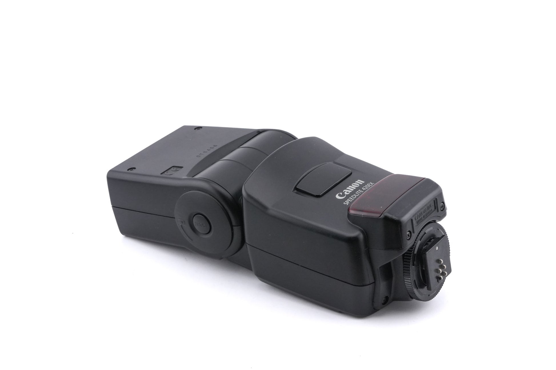 Speedlite flash made by Canon. Autozoom flash with a range of 24-105mm. The unit is equipped with a wireless sensor for E-TTL as a ”slave” unit. Flash has clicked tilting 90° angle and horizontal movements to left 180° and right 90°. It also features a full auto mode. Plastic body available in black.