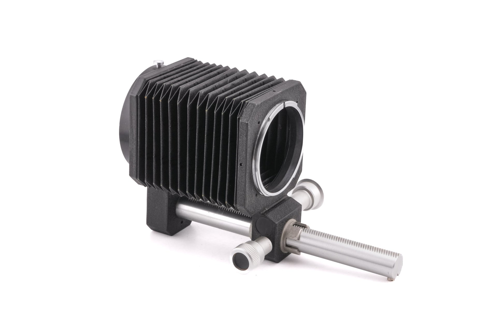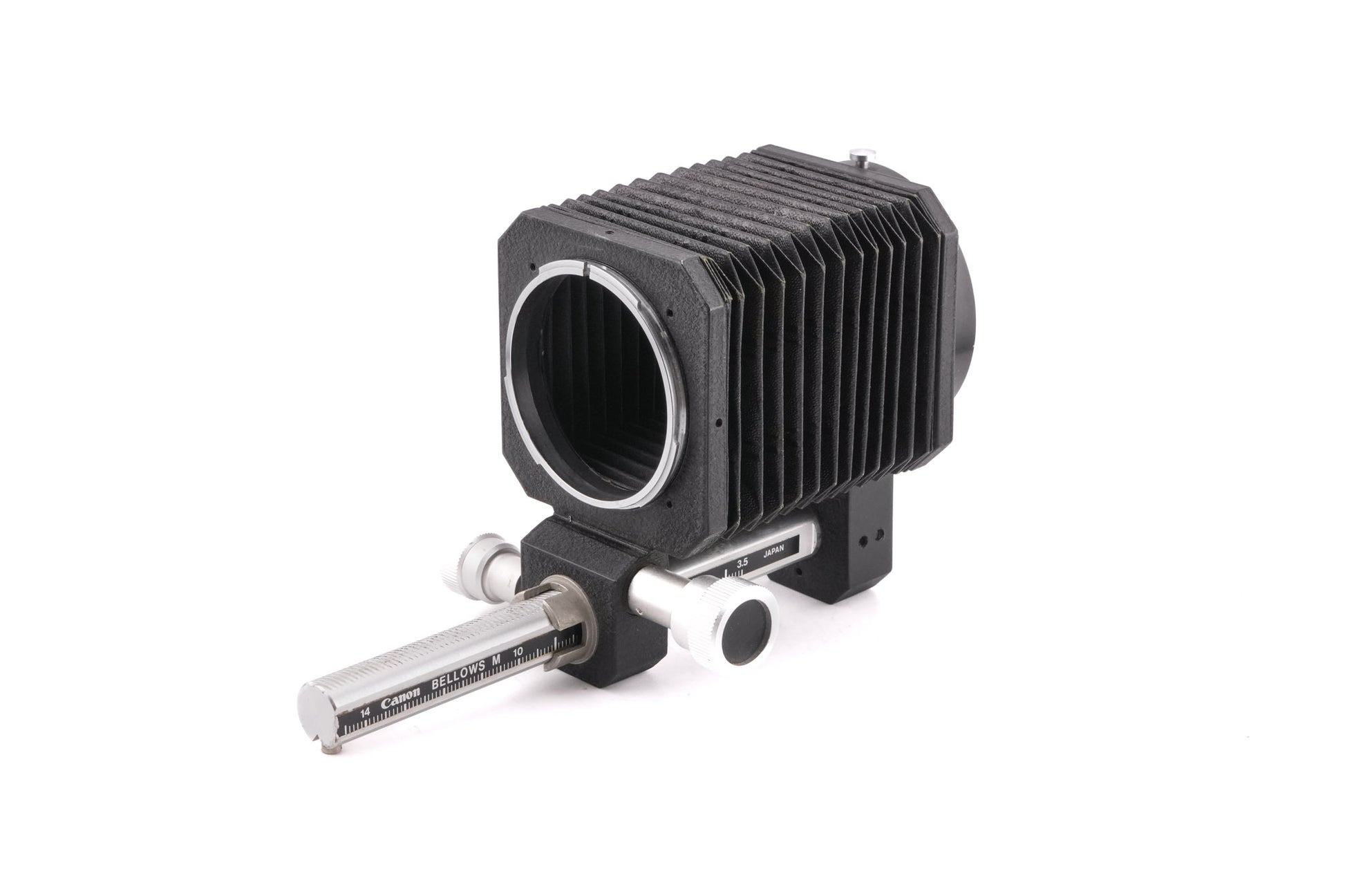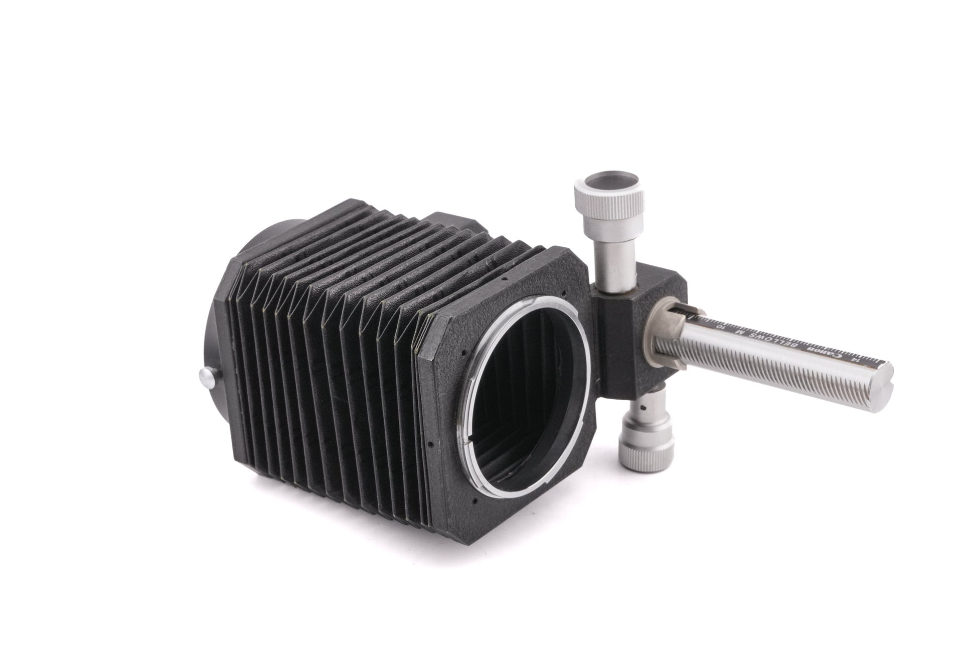 Macro bellows unit made for Canon FD-system lenses and cameras introduced by Canon. The Bellows M allows for extension from 33 to 145mm. It has an adjustment knob and tightening knob and a tripod mounting thread. Metal body available in black.