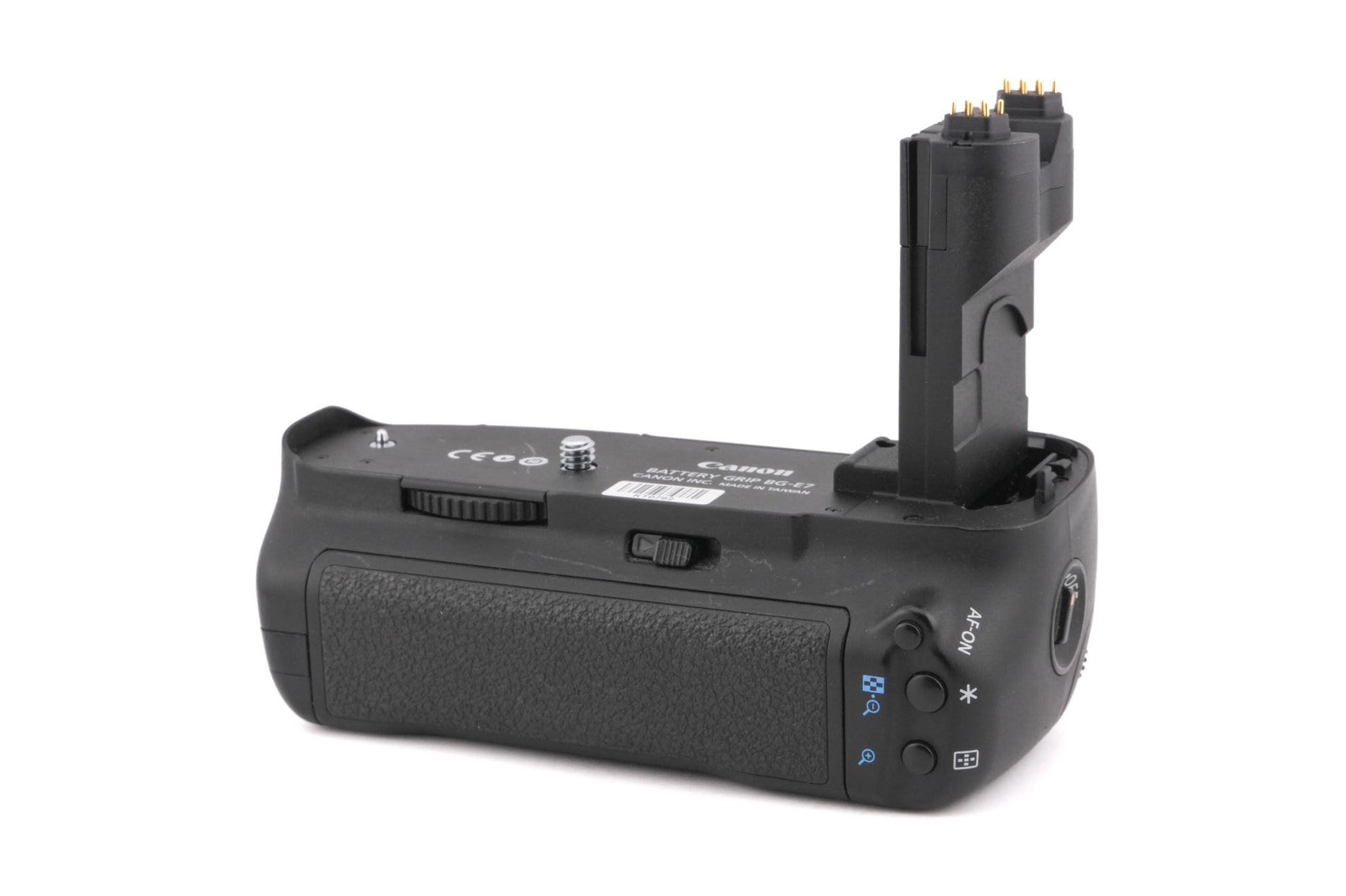 Battery grip made by Canon for the EOS 7D. It uses two LR-E6 batteries or six AA batteries with the BGM-E7 battery holder. The grip has the following controls for vertical photography: Shutter release, Main Dial, AF Point Selection, AF/FE Lock, AF-ON, and ON/OFF switch. Plastic body available in black.