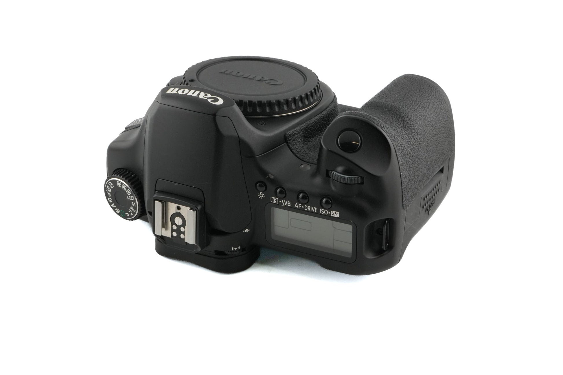 Autofocus EF-S mount digital SLR released by Canon in 2007. It has 9 autofocus points, interchangeable focusing screens, a 3" rear screen, and a built-in pop-up flash. It uses Compact Flash (CF) memory cards. Magnesium alloy body available in black.