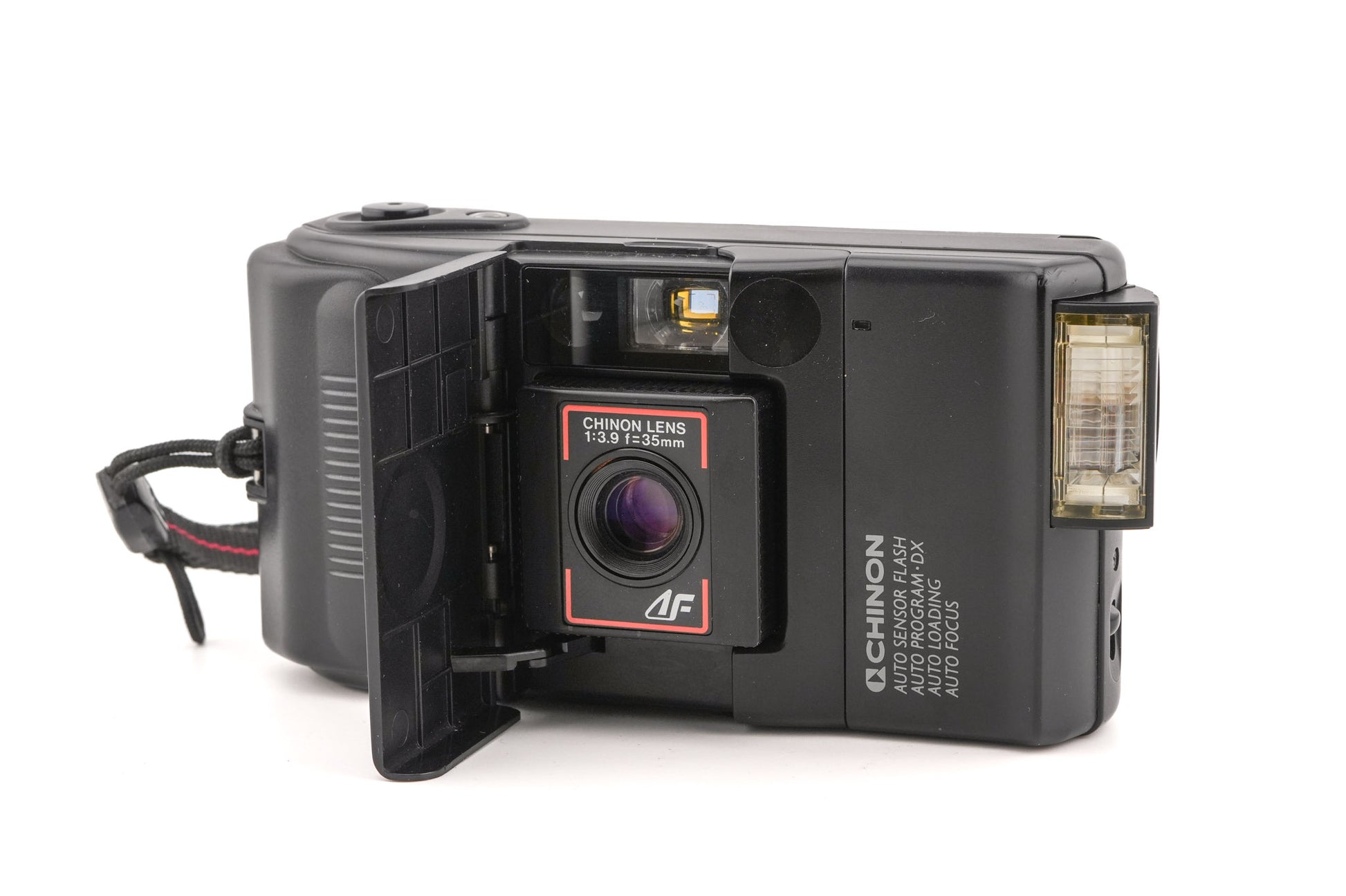 Autofocus 35mm film point & shoot camera made by Chinon. It has a front door-style lens cover that doubles as a power button. The flash is on by default and can only be switched off when holding it down with a finger (it will not lock down). Plastic body available in black.