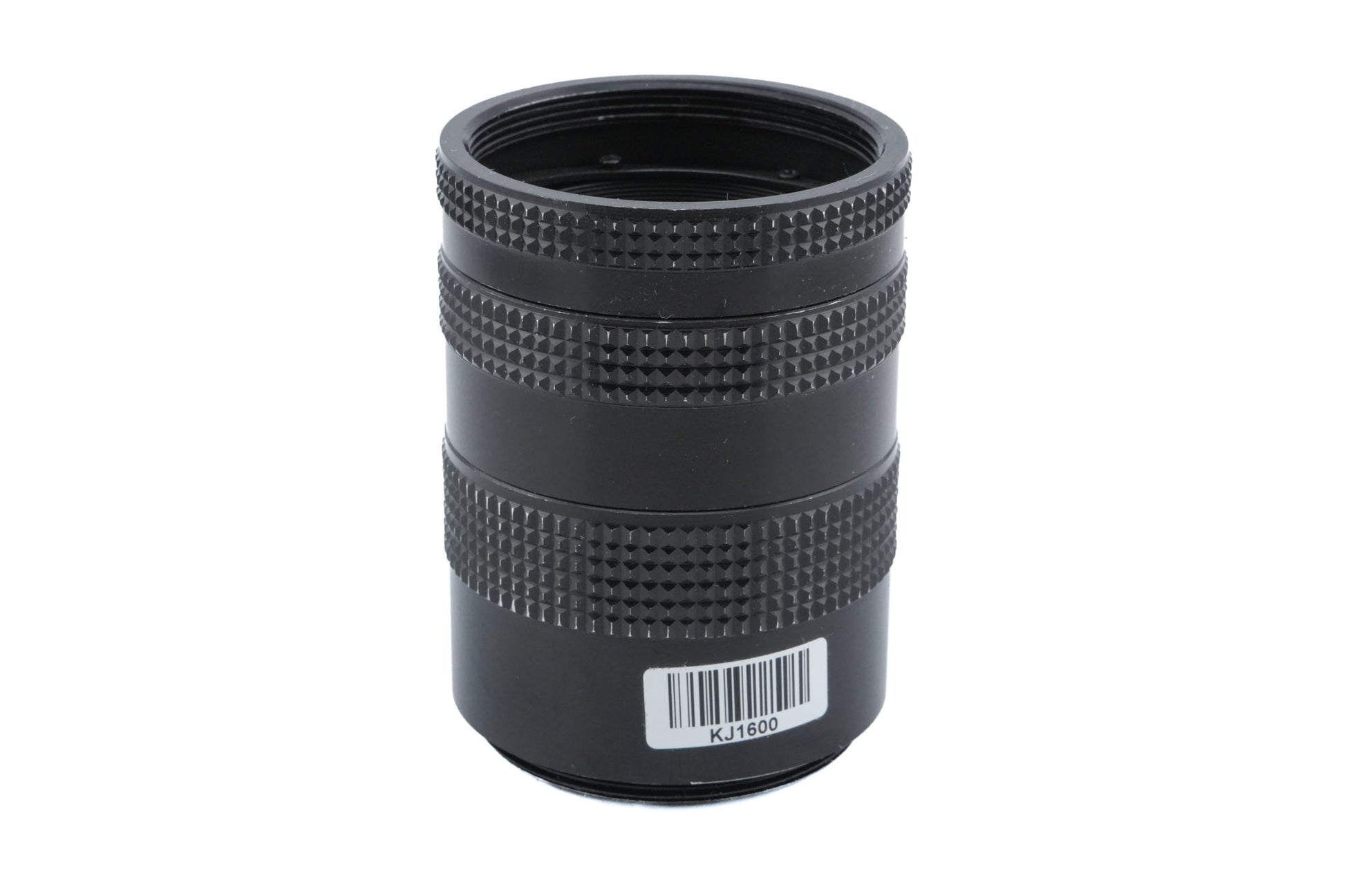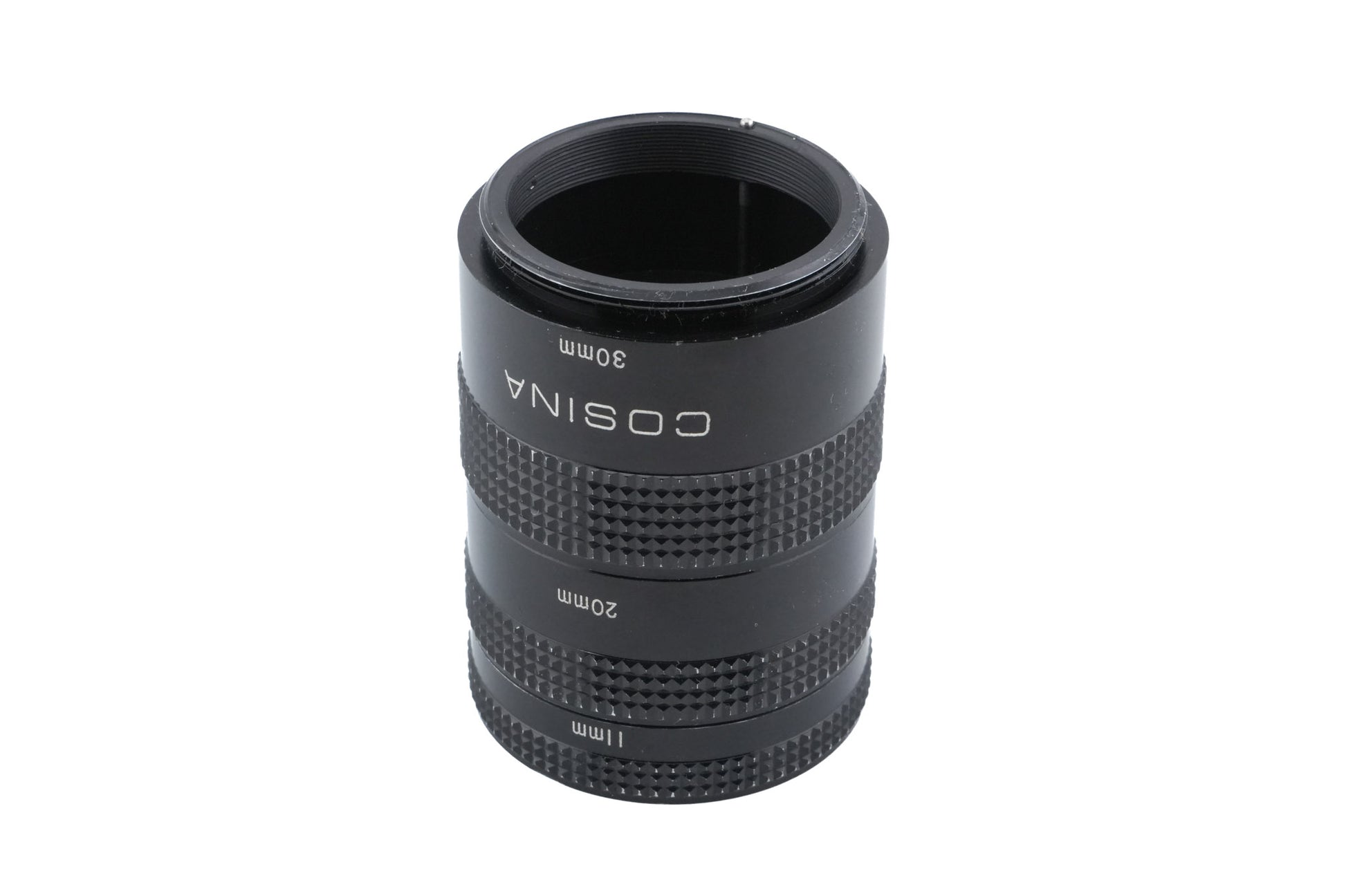 Set of 30mm, 20mm, and 11mm extension tubes made for M42 screw mount cameras and lenses by Cosina. Metal body available in black.