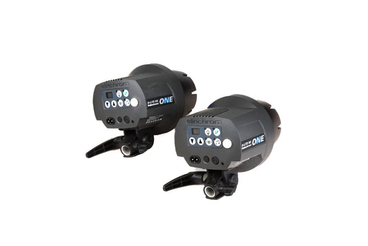 Studio flash made by Elinchrome. Plastic construction available in black.