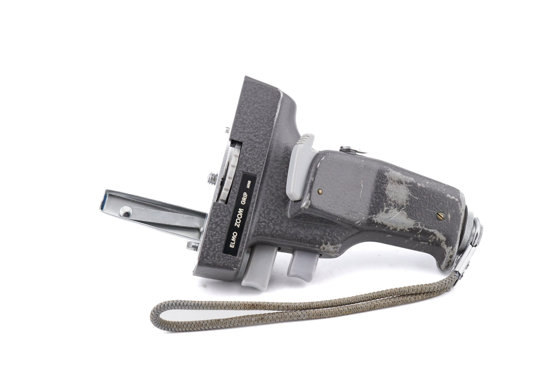 Zoom grip made by Elmo for the 8-EE Zoom Auto Eye 8mm cine camera. Allows you to zoom in and out with one hand. Metal body available in grey.