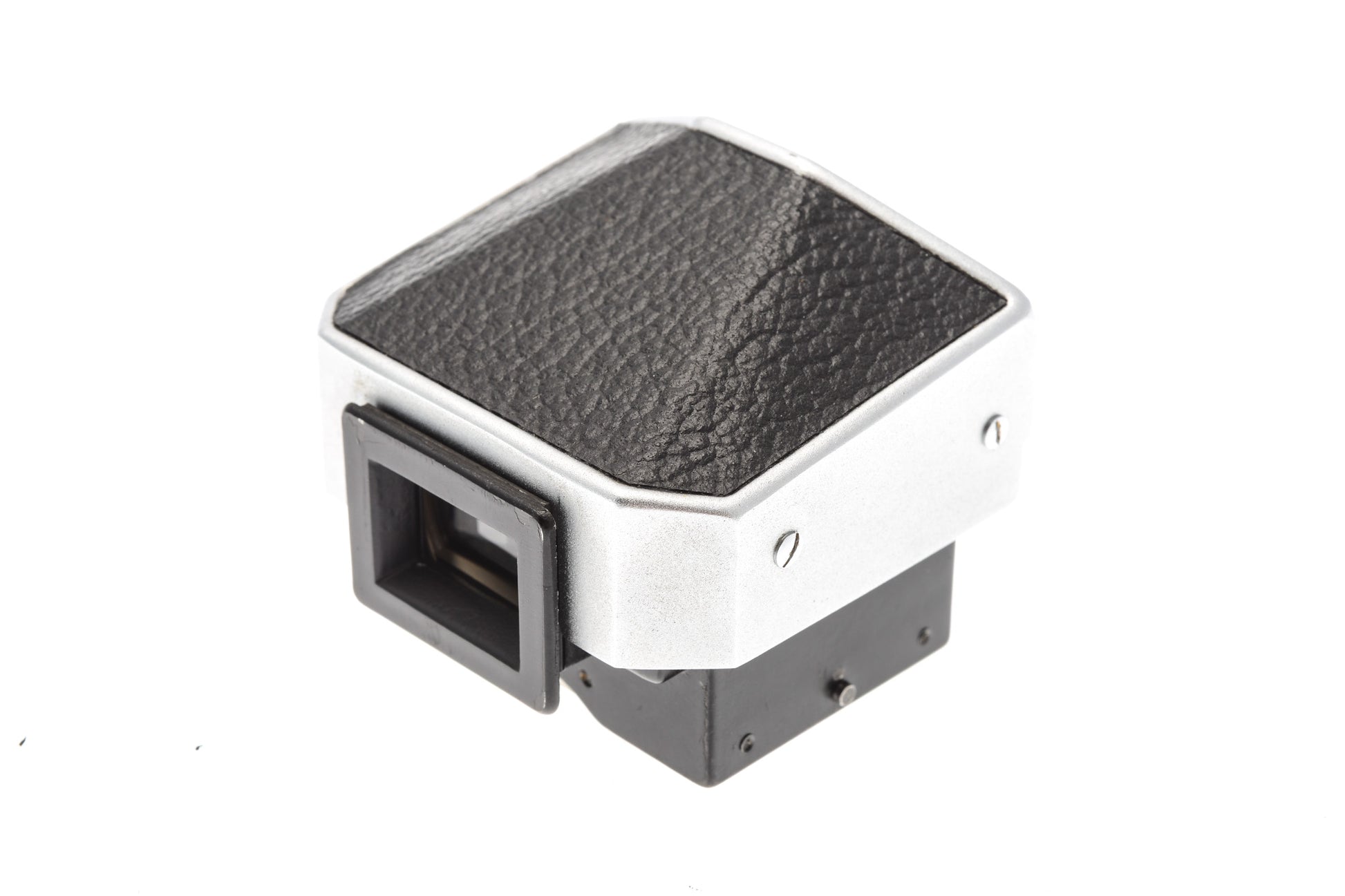 Prism finder made by Exakta for the Ihagee Exakta cameras. Chrome metal body with leather top cover and plastic eyeframe.
