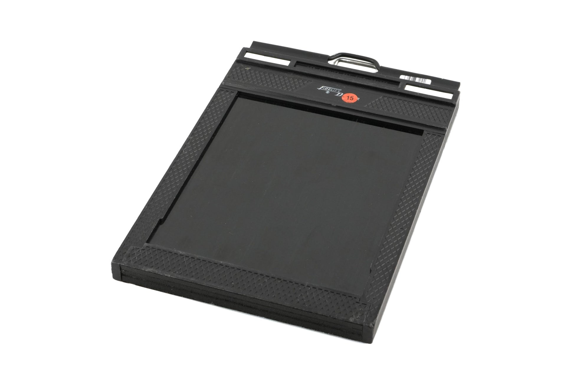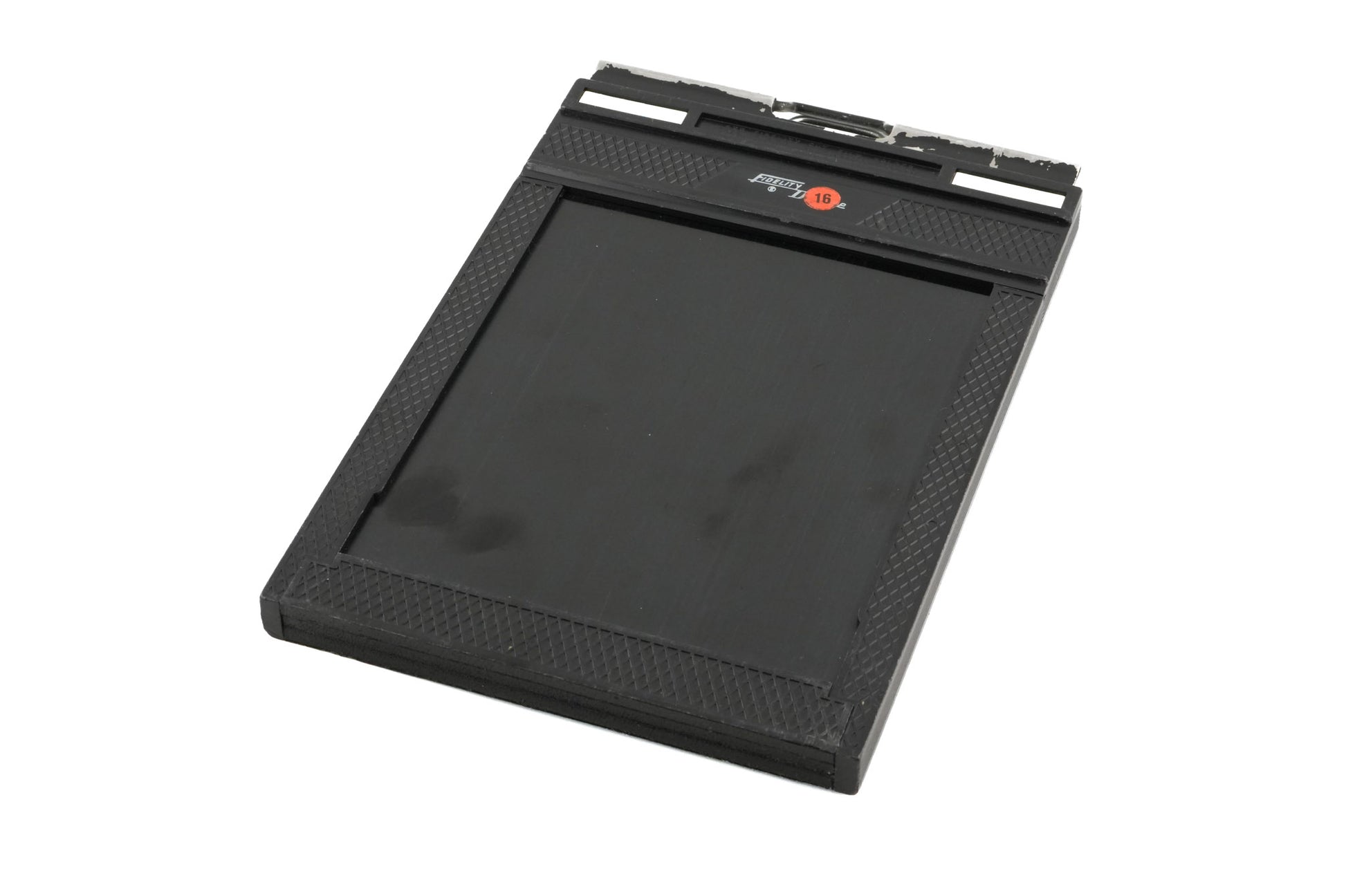 4x5" sheet film holder. Each holder can hold two sheets of film, one on each side. Made in the USA. Black plastic construction.