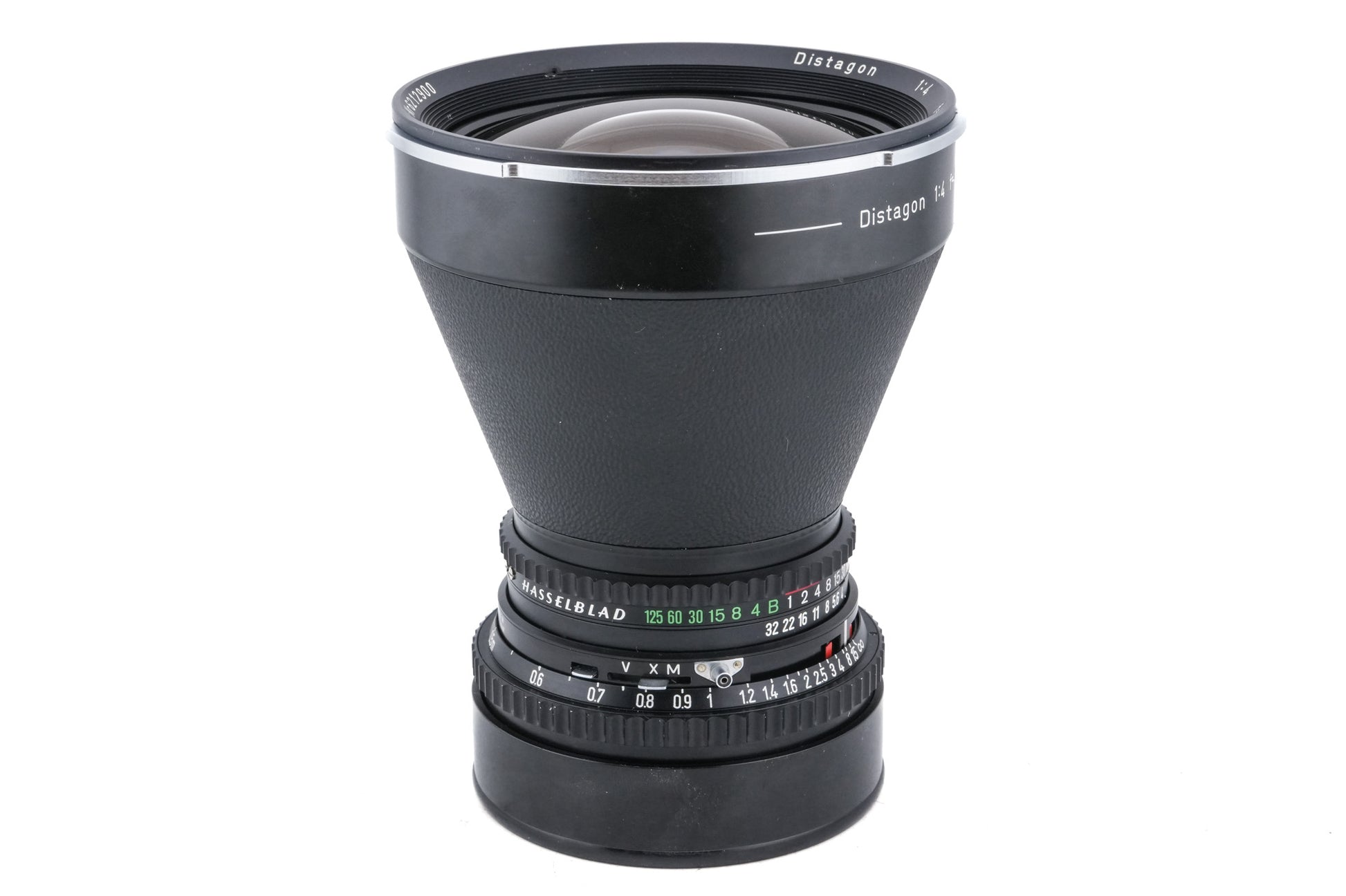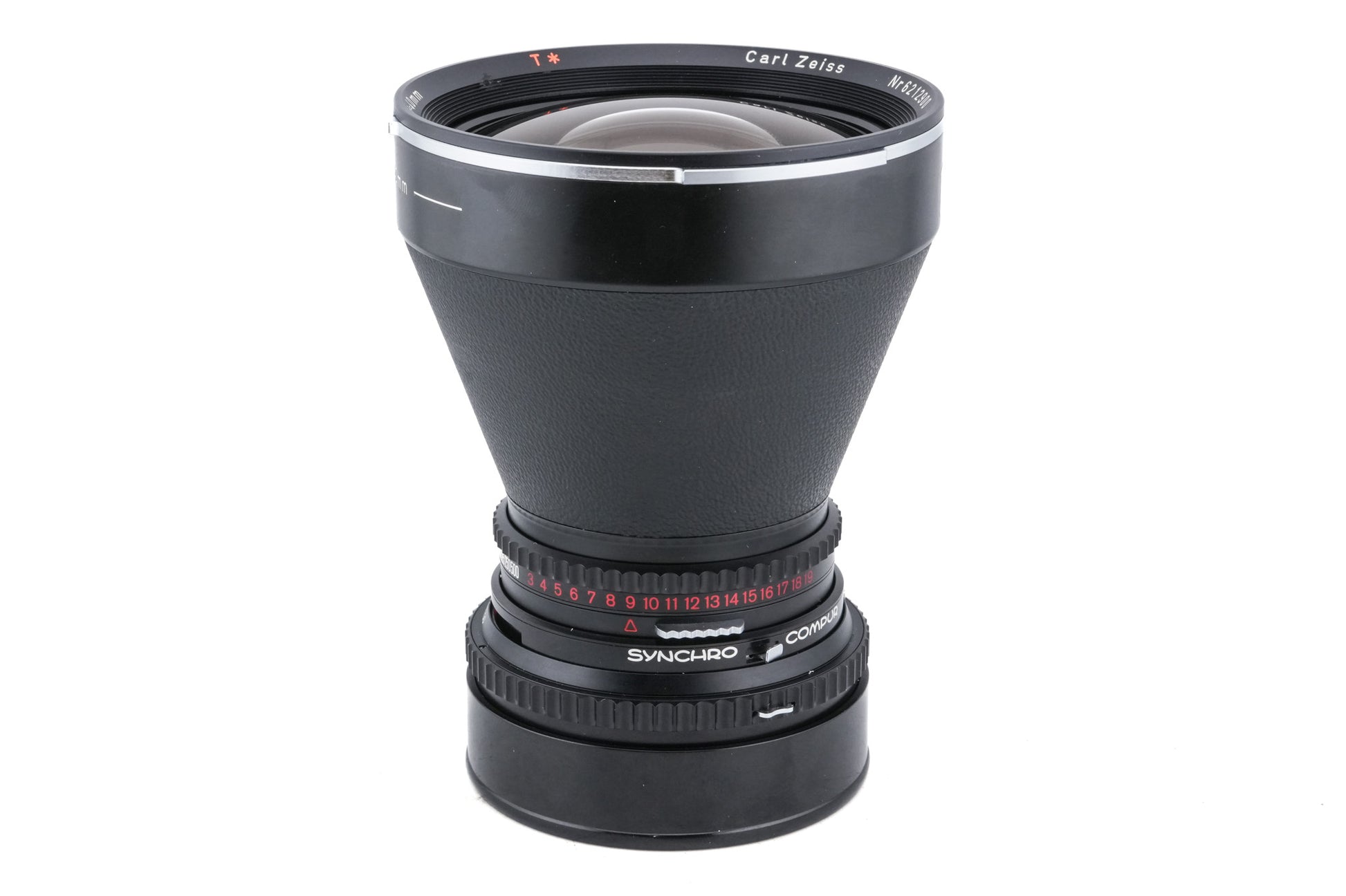 Manual focus wide-angle lens made for the Hasselblad V system by Carl Zeiss starting in 1973. It gives the equivalent field of view to a 22mm lens on full frame/35mm. It has a focus limiter tab that needs to be pressed in order to enable close focus. Metal body available in black.