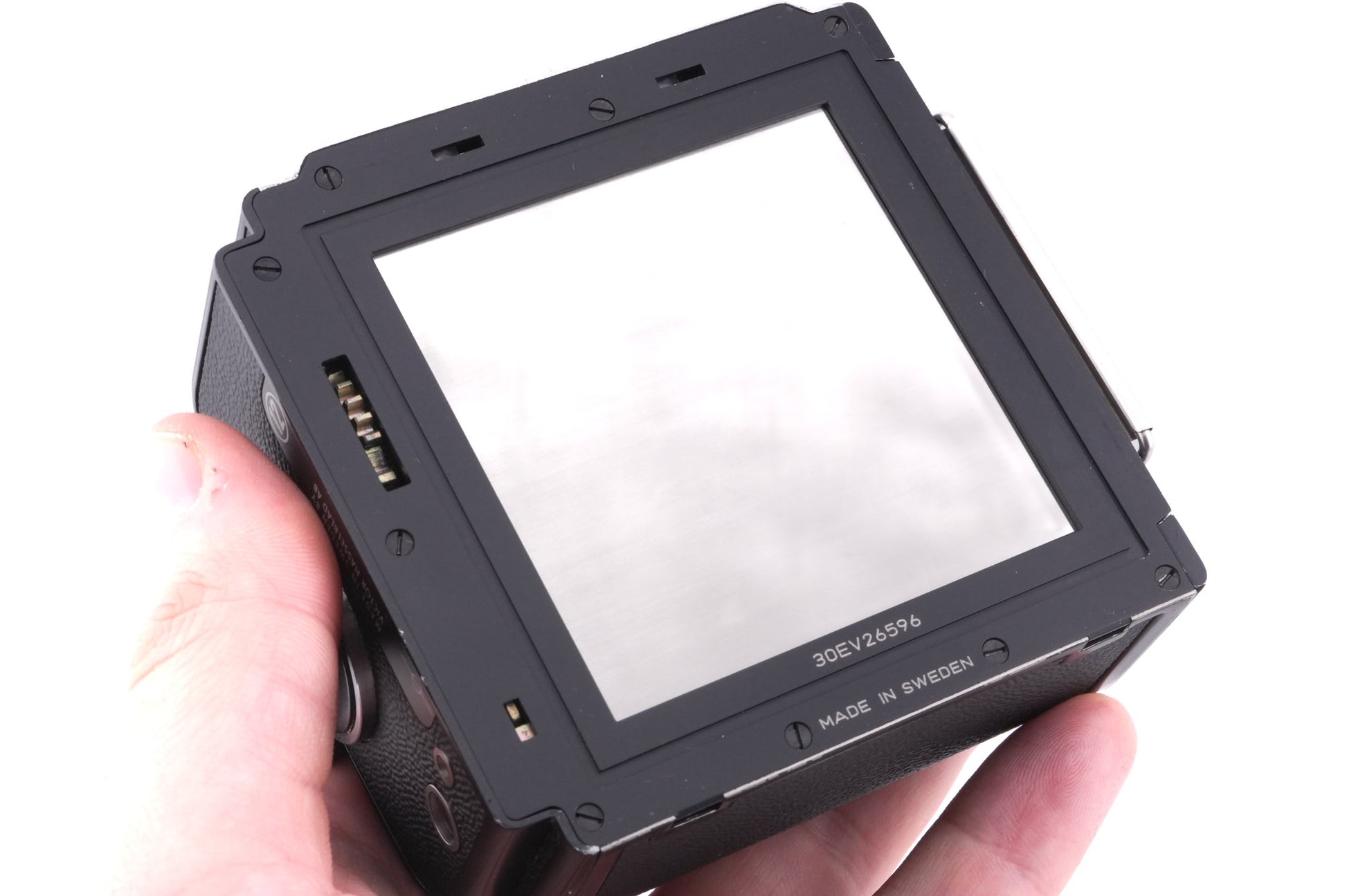 Manual focus V series 120 SLR camera released by Hasselblad in 1970. Its major improvement over the 500C was the addition of a user-interchangeable focusing screen. It is a system camera with interchangeable lenses, prisms, grips, winders, and film backs. Metal body available in black (10170).
