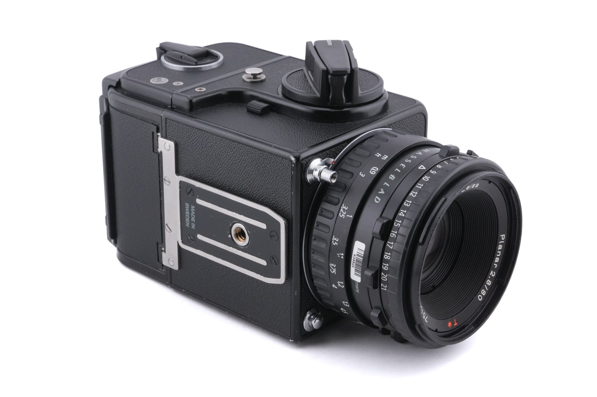 Manual focus 6x6 120 medium format modular V-mount SLR camera introduced by Hasselblad in 1989. It added off the film (OTF) metering, flash control, and a much brighter Acute-Matte focusing screen to the already-popular 500C/M body. It is a fully modular camera, with interchangeable lenses, prisms, grips, winders, focusing screens, and film backs. There was a model made for the Japanese market. It has a small star on the nameplate. Metal body available in silver or black.