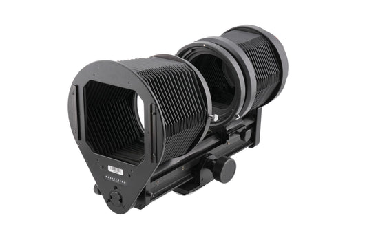 Automatic bellows extension for the Hasselblad V system cameras introduced in 1979 by Hasselblad. An updated design that no longer needed the double cable release. It uses a telescoping tube to connect the body to the lens through the bellows unit. Metal body available in black.