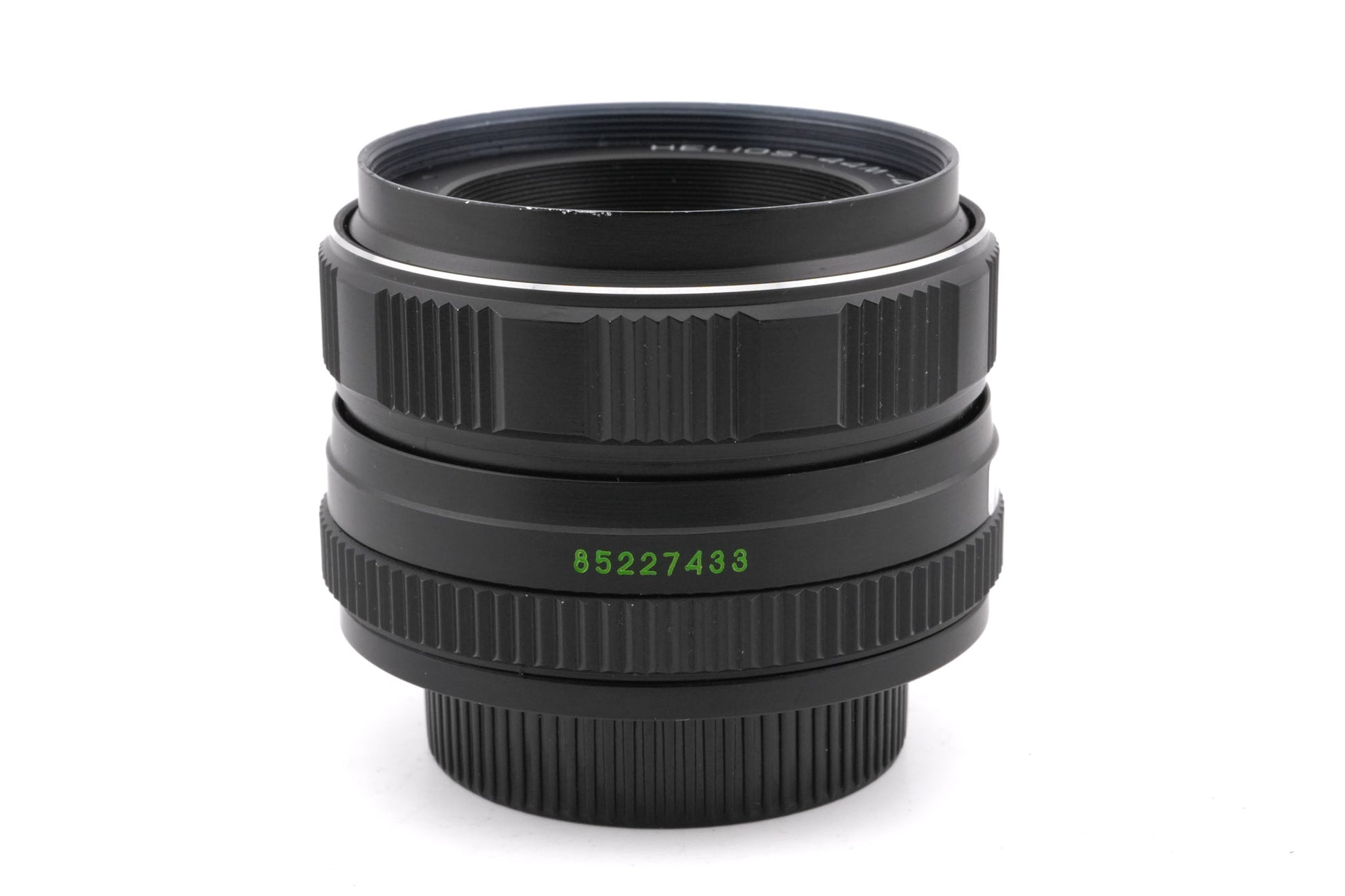 Manual focus normal lens made for M42 mount 35mm SLR cameras in the Soviet Union. Produced as the standard lens for many Soviet SLRs, including Zenits, and produced by many Soviet factories, including KMZ, Zenit, and Valdai. Based on the Carl Zeiss 58mm f2 Biotar. This version lacks an automatic/manual aperture switch. Metal body available in black.