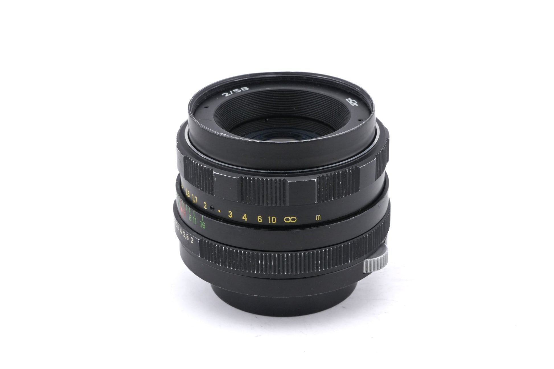 Manual focus normal lens made for M42 mount SLR cameras in the Soviet Union. Many factories made Helios lenses, including KMZ and Valdai. Metal body available in black.