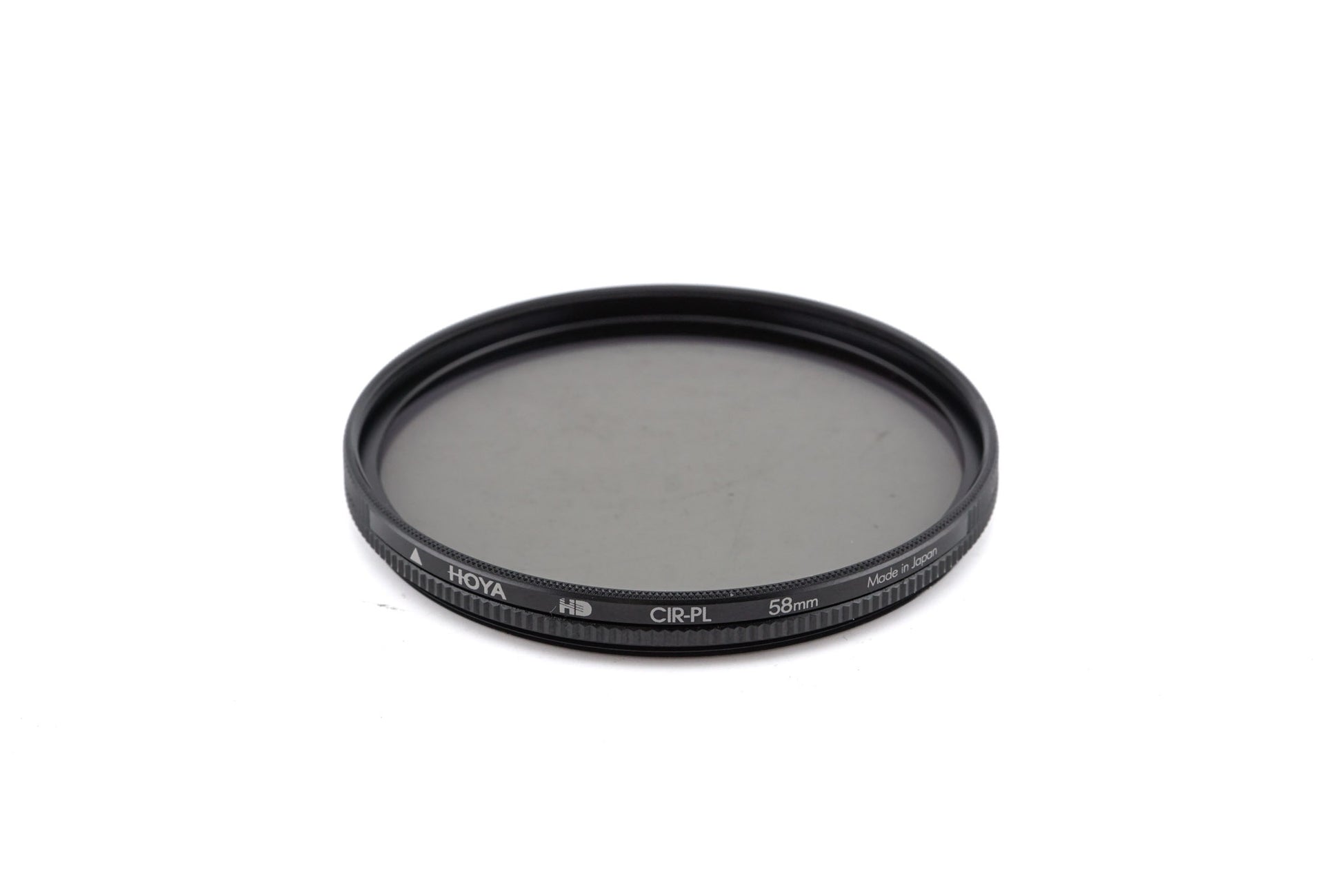 Circular polarizing filter from Hoya for lenses with 58mm filter threads. Rotates to allow for glare and reflection correction at any angle. Black metal construction with knurled sides.