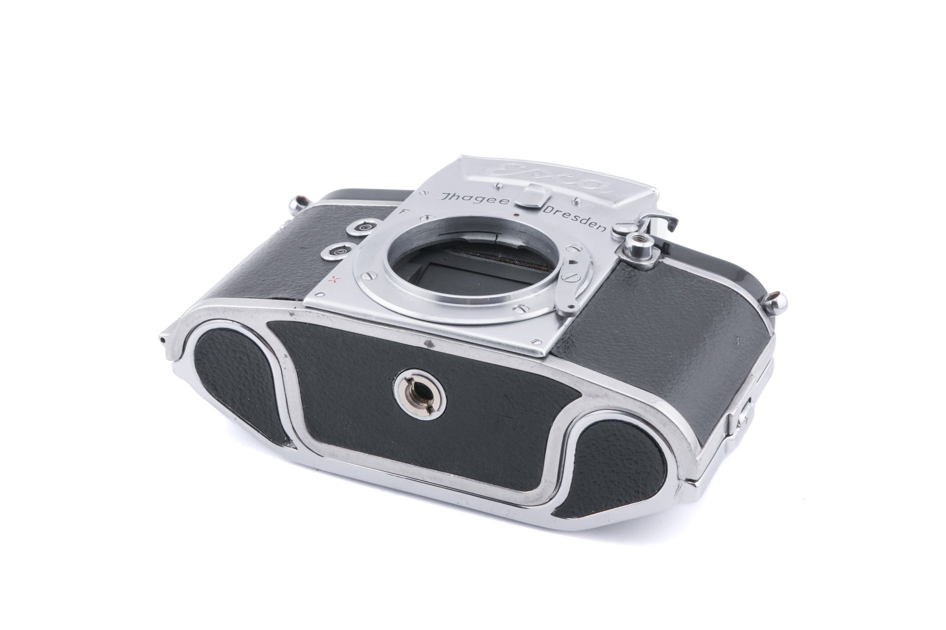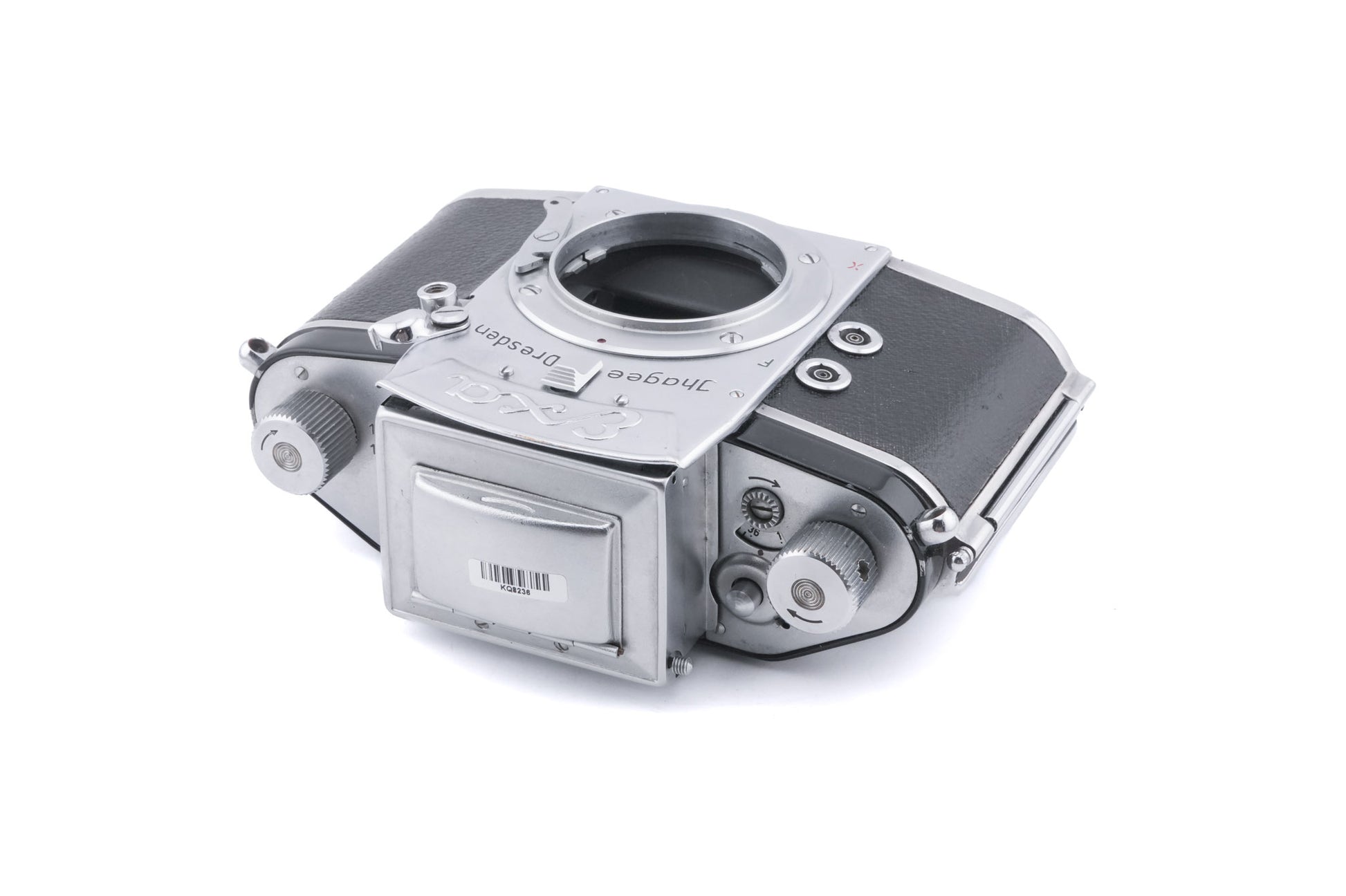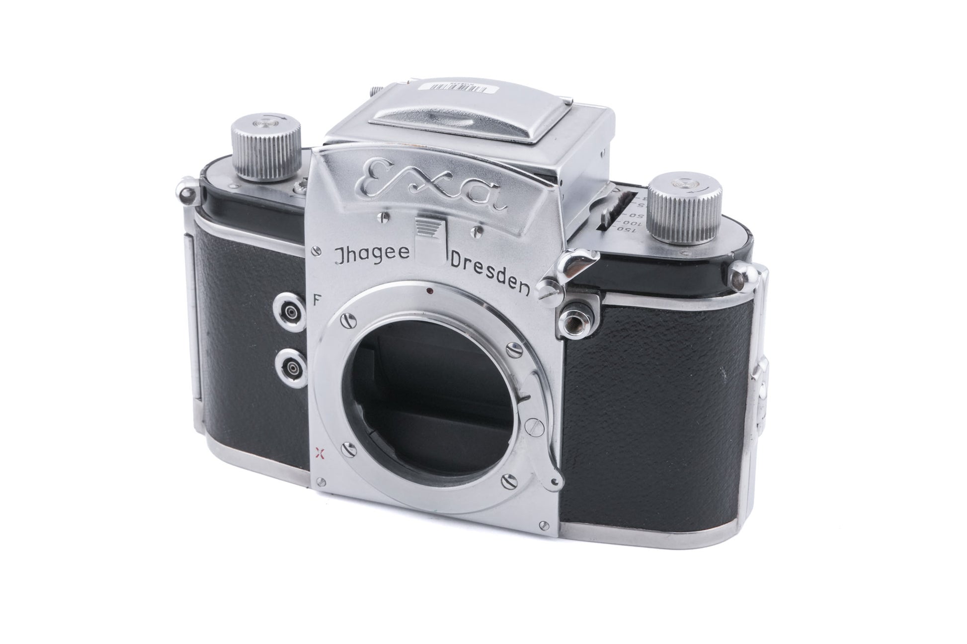 Manual focus Exakta mount 35mm SLR camera made by Ihagee from 1950-1962. Many different variants of this camera were produced during its lifespan. Metal body available in silver.