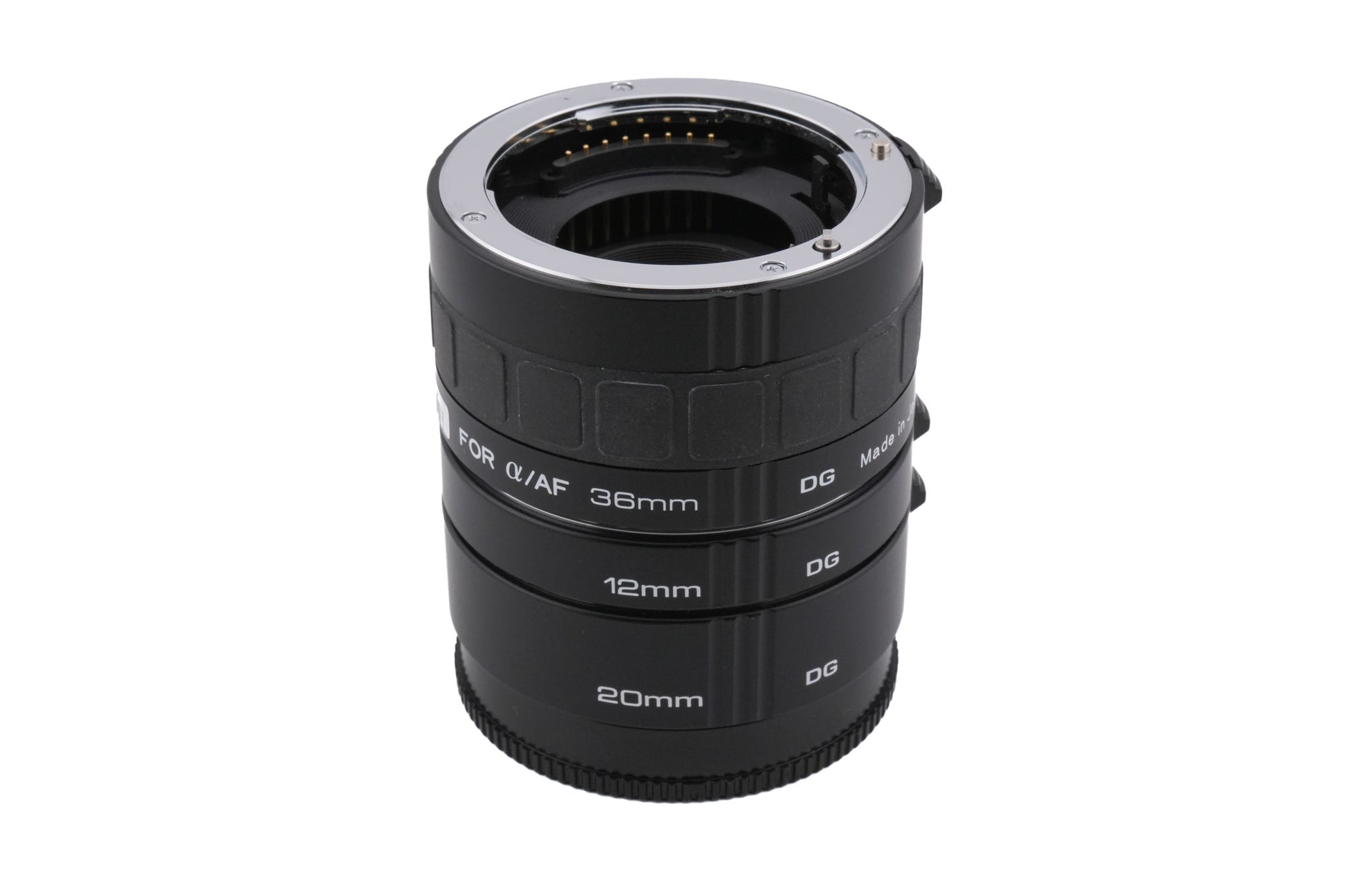AF extension tubes made by Kenko for Sony A-mount lenses. 12mm, 20mm, and 36mm tubes, which can be used in any combination or individually. Metal and plastic body available in black.