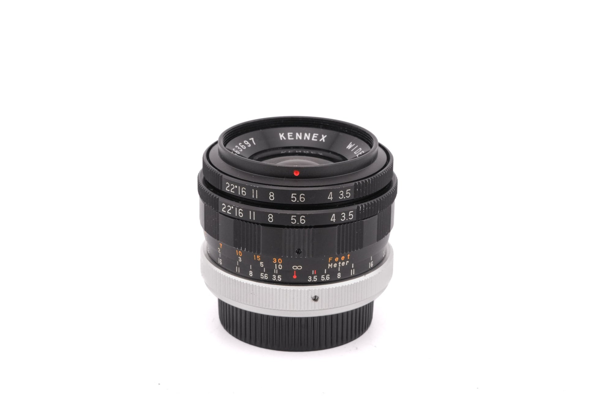 Manual focus wide normal lens made for M42 screw mount 35mm SLR cameras introduced by Kennex. It has a pre-set aperture. Metal body available in black.