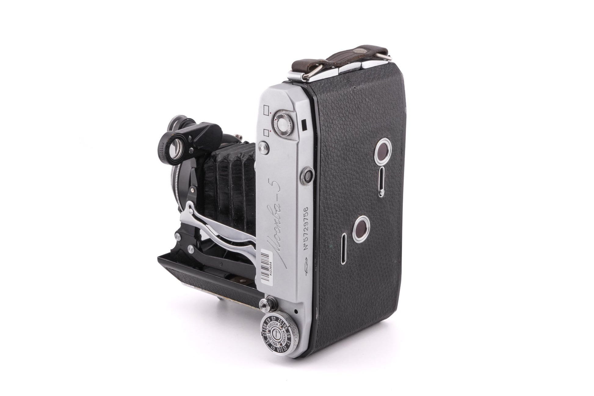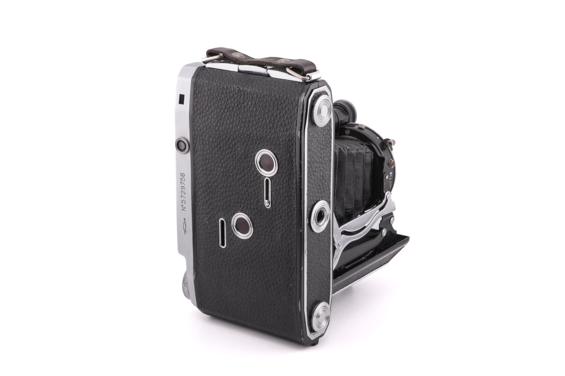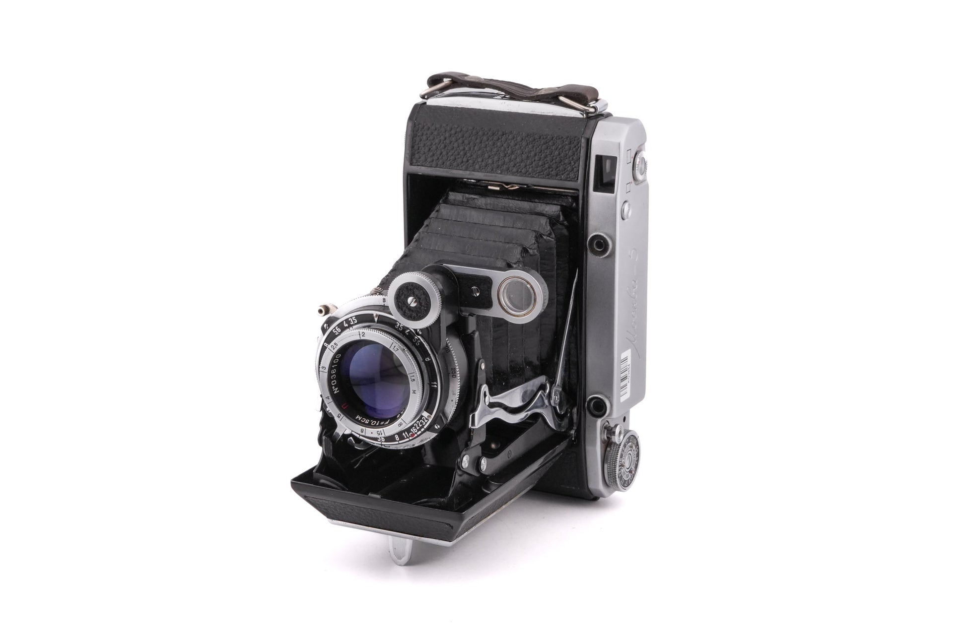 Manual focus 120 medium format 6x9/6x6 folding camera made by Soviet factory KMZ introduced in the 1950s. It has a built-in coupled rangefinder. Metal body available in black.