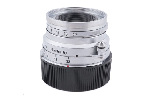 Manual focus wide-normal lens made for LTM / M39 mount 35mm rangefinder cameras by Leica. There are variants that use slip-on A36 filters and variants that use 39mm screw-in filters. Metal body available in silver.