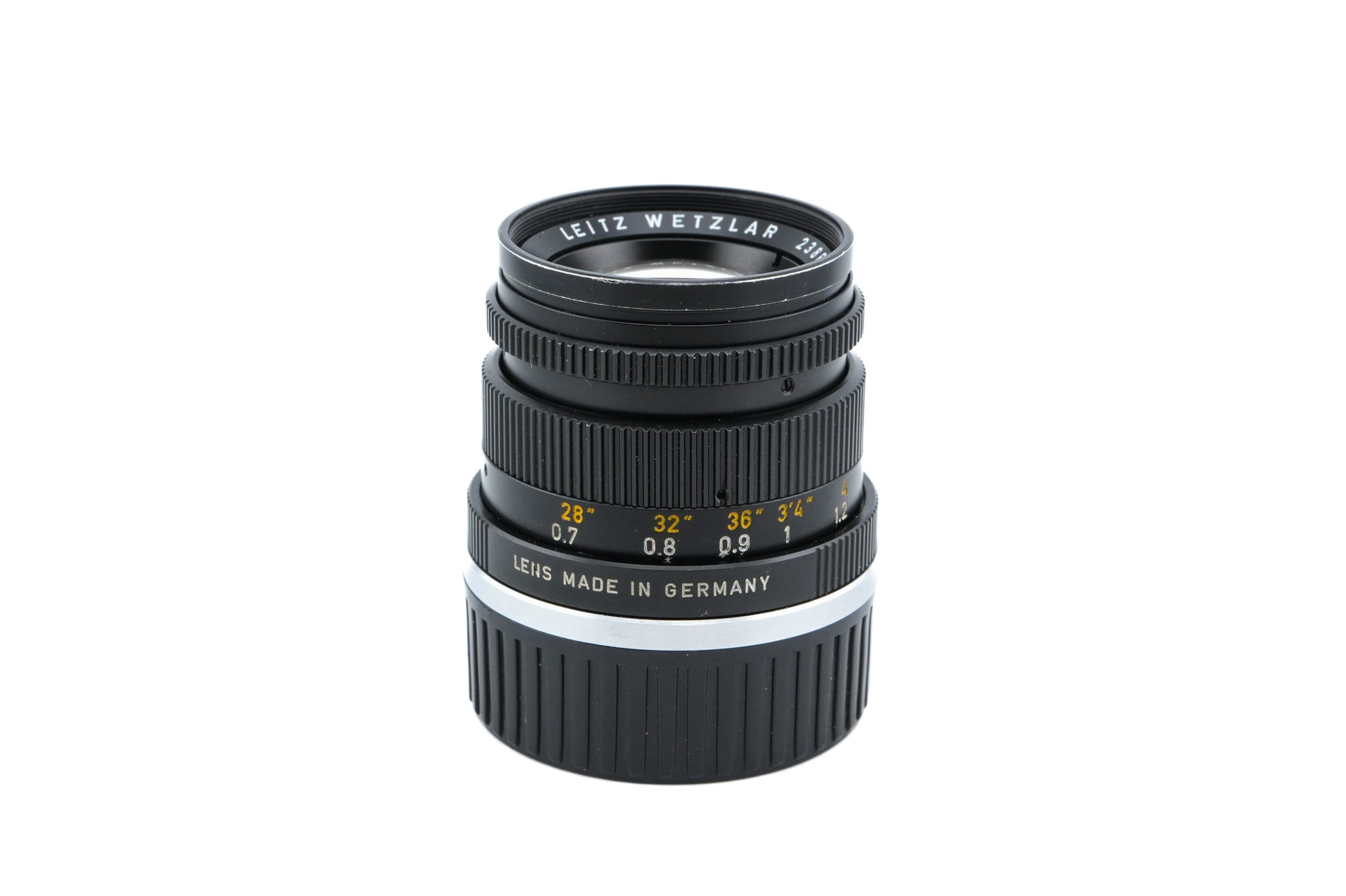 Manual focus normal lens made for M-mount rangefinder cameras introduced by Leica in 1969. Leica made many different versions of the 5cm f2 Summicron that differ in both design and optical formula. This is the third model of the lens. The optical formula changed from 7 elements to 6, and it was advertised as a lightweight version without the infinity lock on the focusing mount. The early examples still have the scalloped focusing ring as seen on the previous versions, but later examples changed to a finer, even knurling. Metal body available in black.
