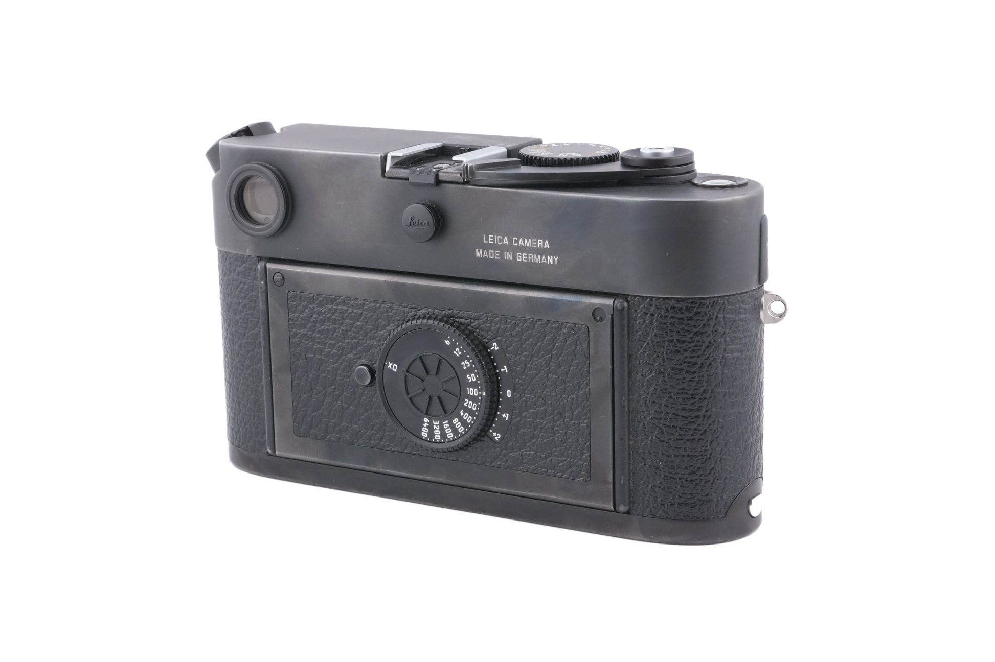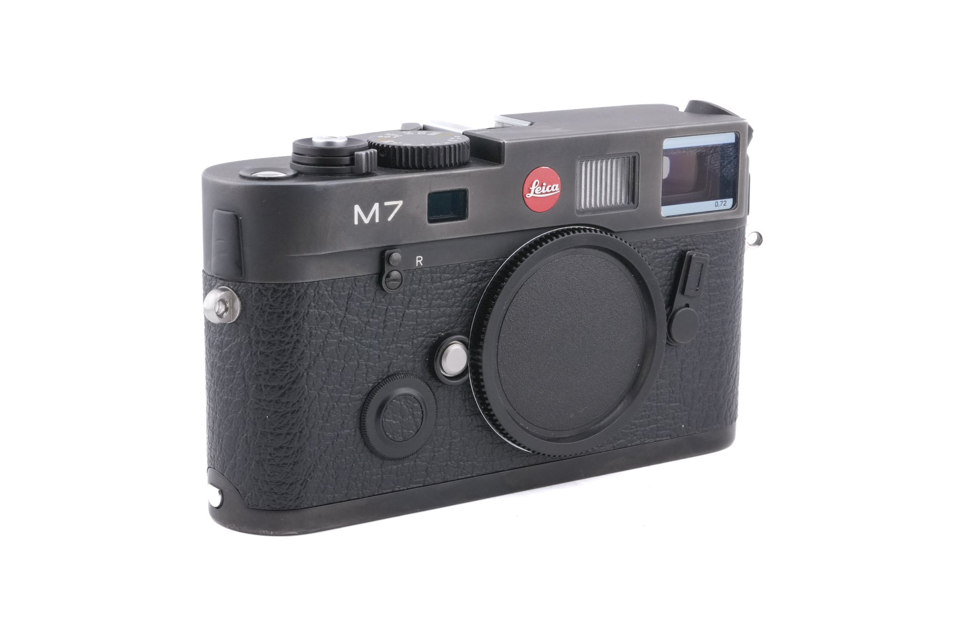Manual focus M-mount 35mm rangefinder camera introduced by Leica in 2002. The M7 is similar to the M6 in appearance, but it added an electronic shutter control with automatic aperture priority. It has a circuit breaker switch around the shutter release button that also acts as a safety catch for the button itself. It was available in three configurations: a 0.72x viewfinder (framelines for 28/90mm, 35/135mm, and 50/75mm), a 0.58x viewfinder (framelines for 28/90mm, 35mm, and 50/75mm), and a 0.85x viewfinder (framelines for 35/135mm, 50/75mm, and 90mm). The 0.72x was available in black and silver, while the 0.58x and 0.85x were available in black only. The camera uses two CR1/3N lithium batteries. Metal body available in black (10503).
