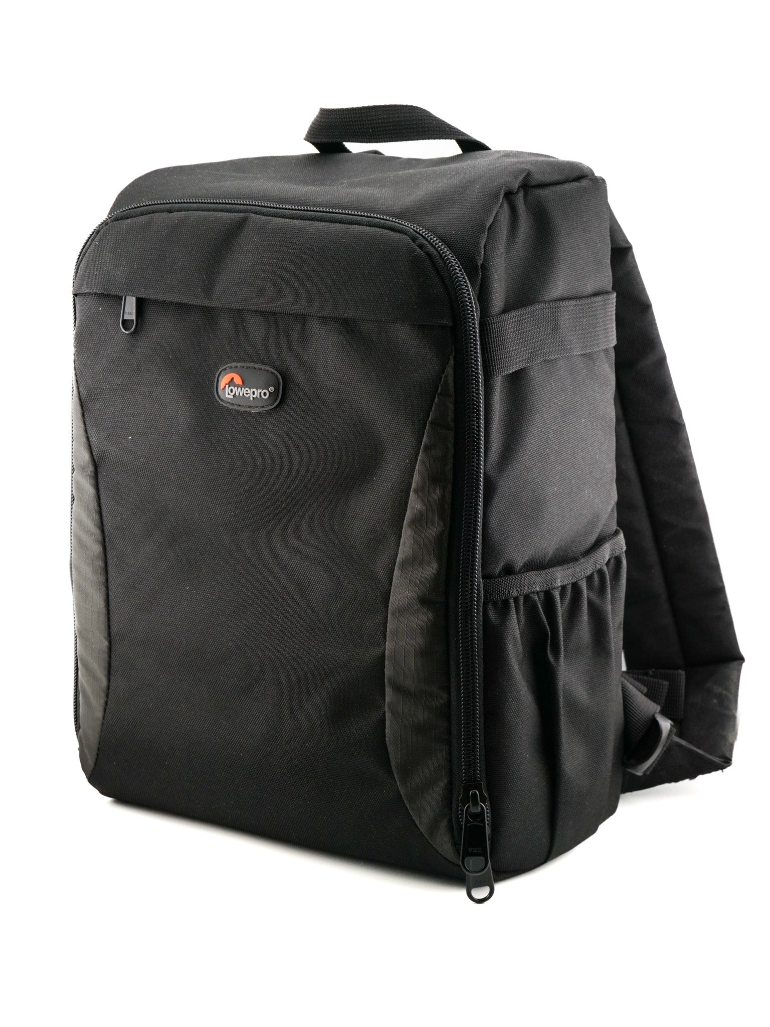 Camera backpack for DSLR bodies and lenses made by Lowepro. Fabric body available in black.