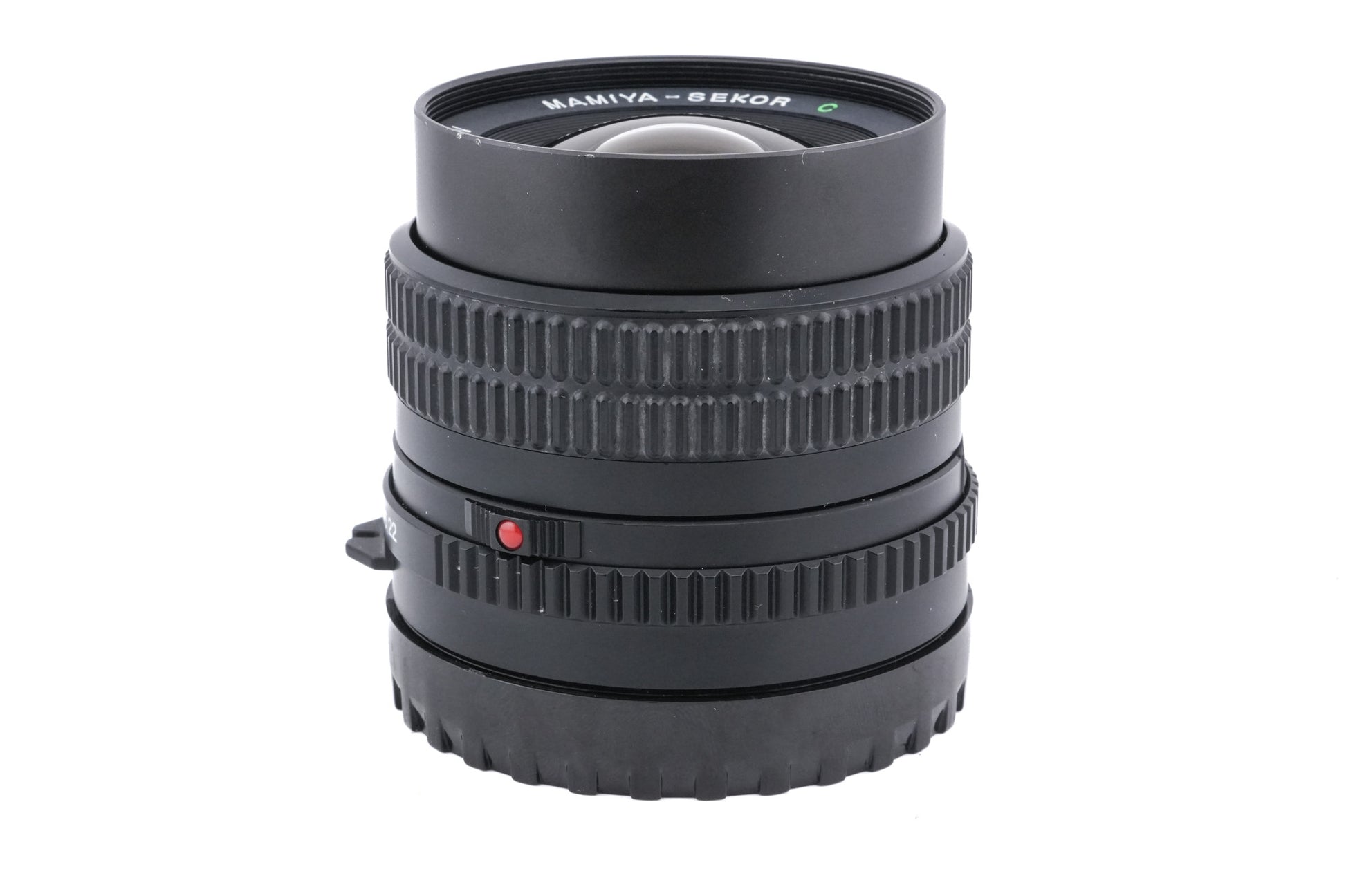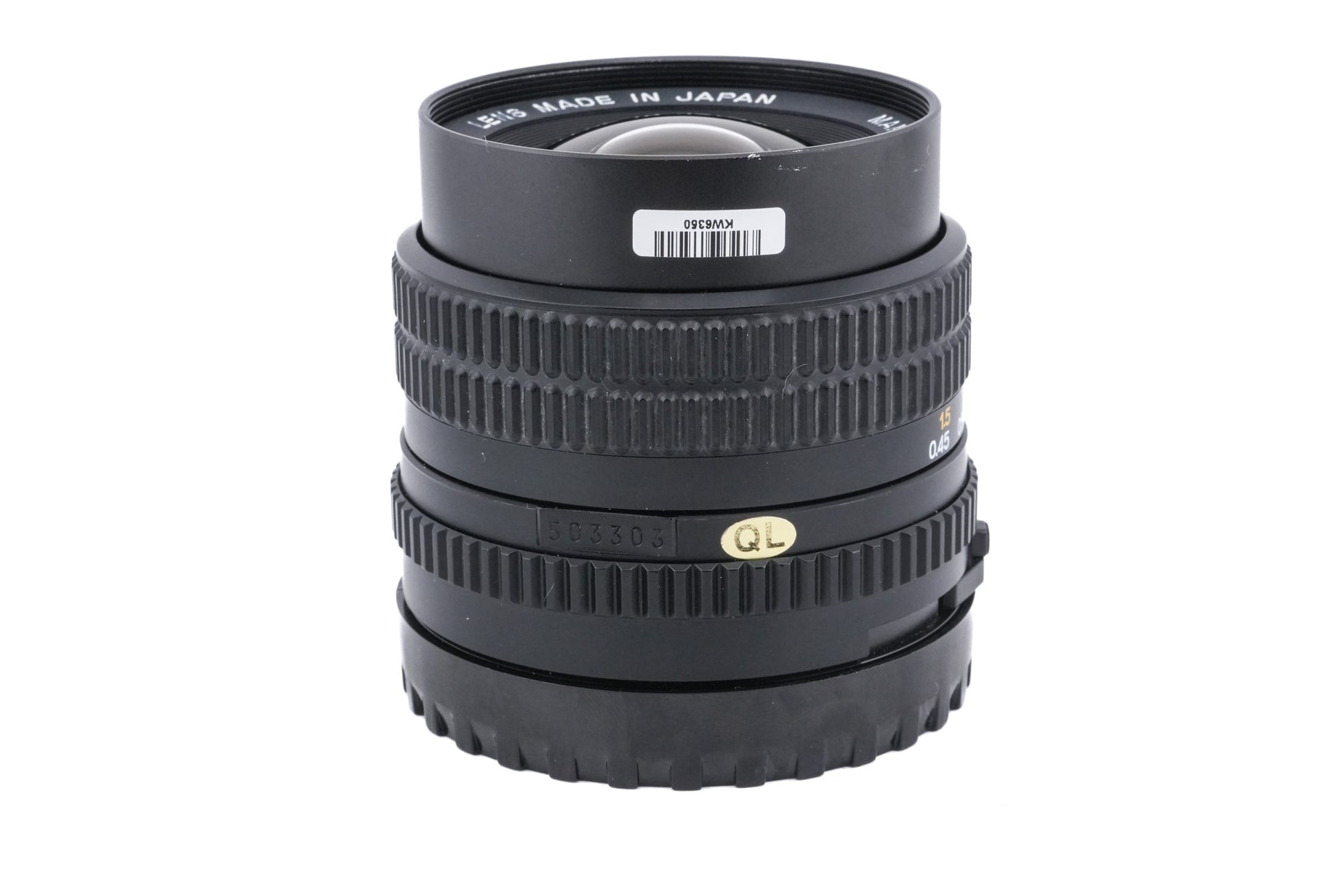Manual focus semi-wide-angle lens made for the Mamiya 645 system introduced by Mamiya. It has a 34mm equivalent focal length. Metal and plastic body available in black.