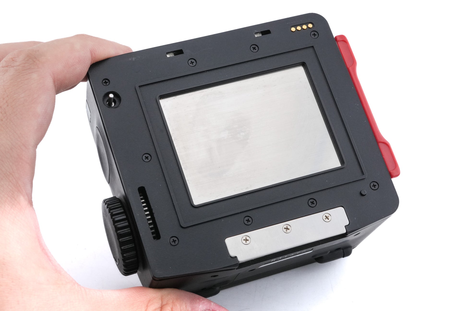 Roll film holder made by Mamiya. Designed for Mamiya 645 Pro / Pro TL. Compatible with 645 Super. It has an ISO film speed dial which will communicate the film speed to the camera body when coupled with the optional AE Prism Finder. Can be used with 120 or 220 film inserts. Has a dark slide pocket and a film memo clip. Plastic and metal body in black with a red accented dark slide.