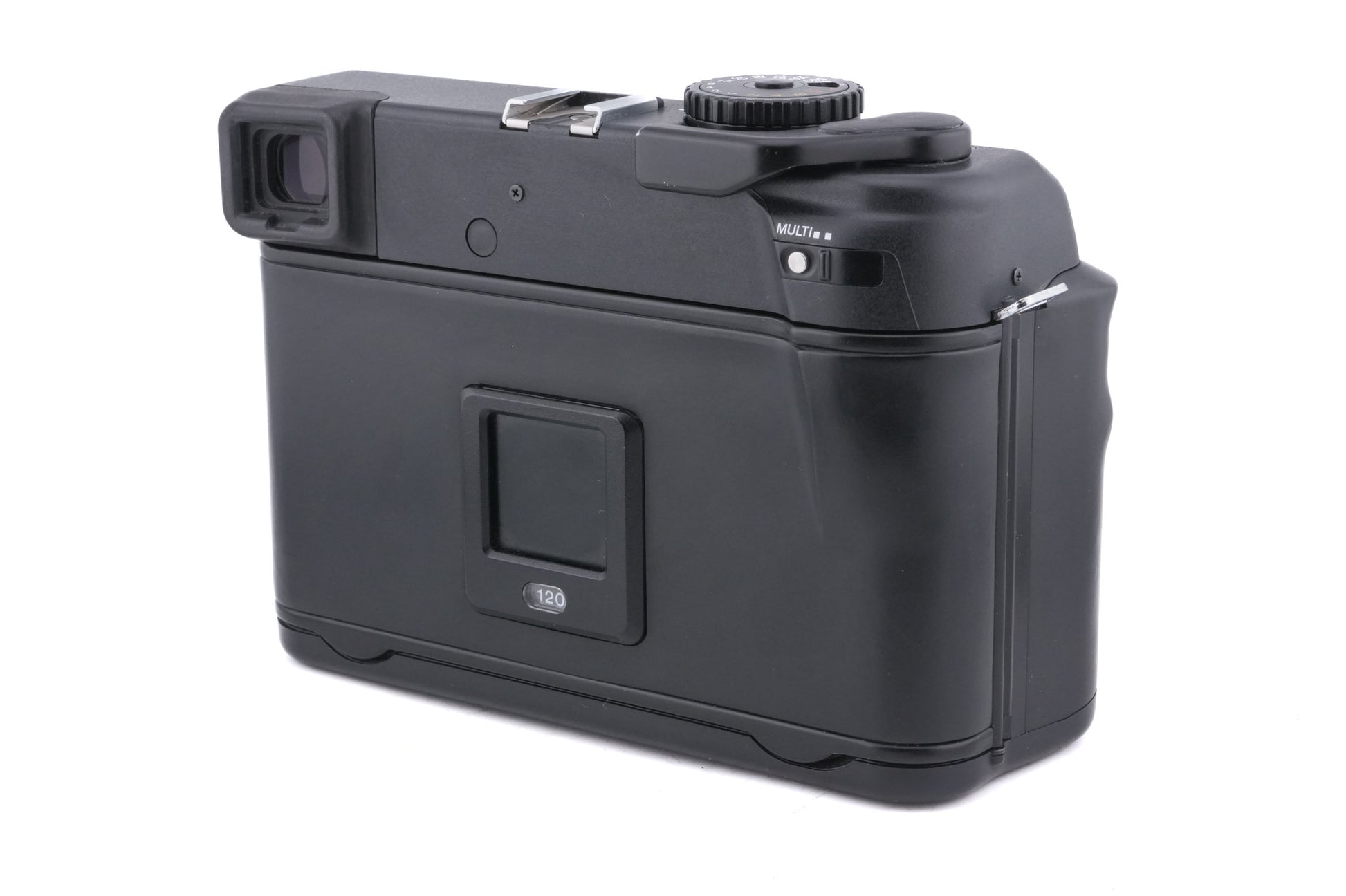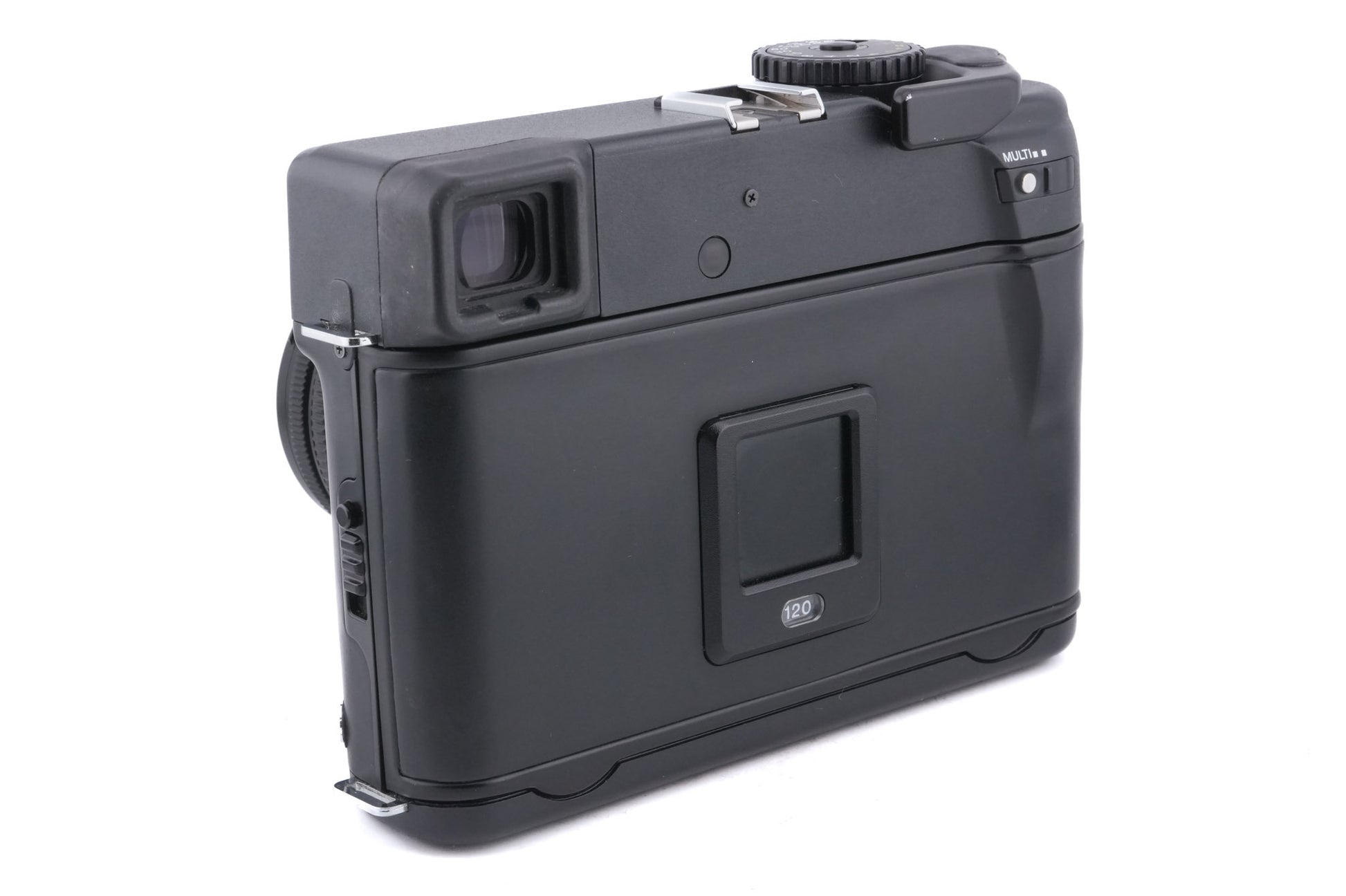 Manual focus 7 mount 120 rangefinder released by Mamiya in 1999. It is capable of aperture priority autoexposure (with +/- 2 EV exposure compensation) as well as manual exposure. It takes 10 6x7cm exposures per roll of 120 film and features a dark slide system for mid-roll lens changes. It has its own series of lenses with built-in leaf shutters. Plastic body available in black and champagne.