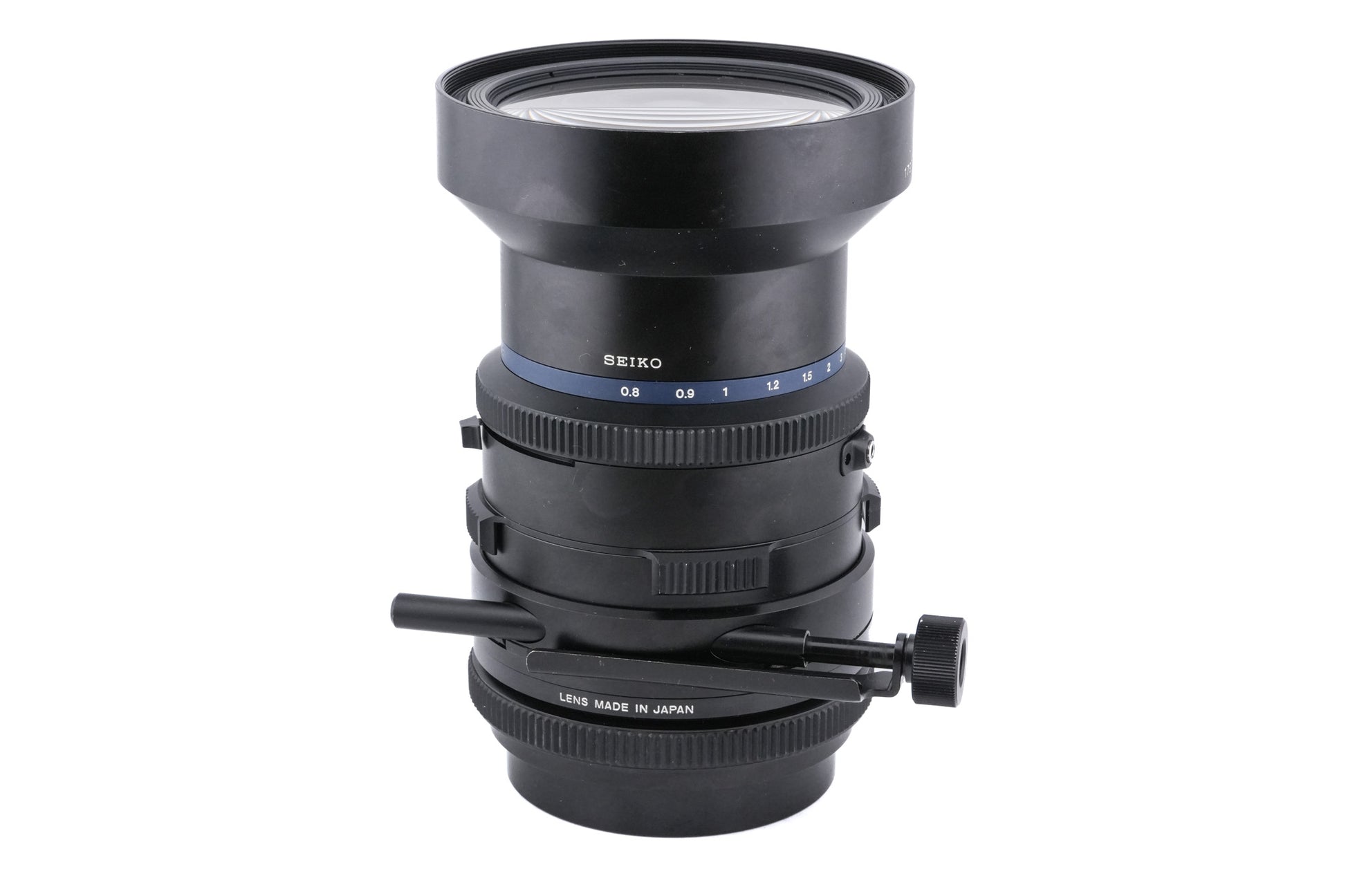 Manual focus wide/normal perspective control lens made for RZ67 mount 120 SLR cameras introduced by Mamiya. The lens must be cocked manually. It has a single direction of shift but can be rotated 360° in 10° increments to allow shifting in any direction. It gives an equivalent focal length of 33.5mm on full-frame. The white lines on the shift scale indicate the 17mm limit that is possible when shifting at an angular orientation to avoid image cut-off. A small amount of cut-off may occur when shifted 17mm or more, both horizontally or vertically (depending on the bellows extension and direction of shift). This will not show up in the viewfinder as it is outside of its field of view. It has markings for in-between aperture stops. Metal body available in black.