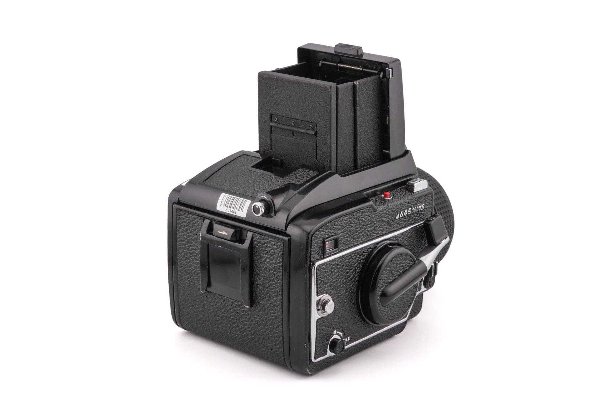 Manual focus M645 mount 120 SLR released by Mamiya in 1976. The 1000S model added a top shutter speed of 1/1000s, a self-timer, and a depth-of-field preview lever over the previous M645. It also features multi-exposure, mirror lockup, and two shutter buttons. The body can be modified with different finders and focusing screens. It takes 15 6x4.5cm exposures per roll of 120 film. Metal body available in black.