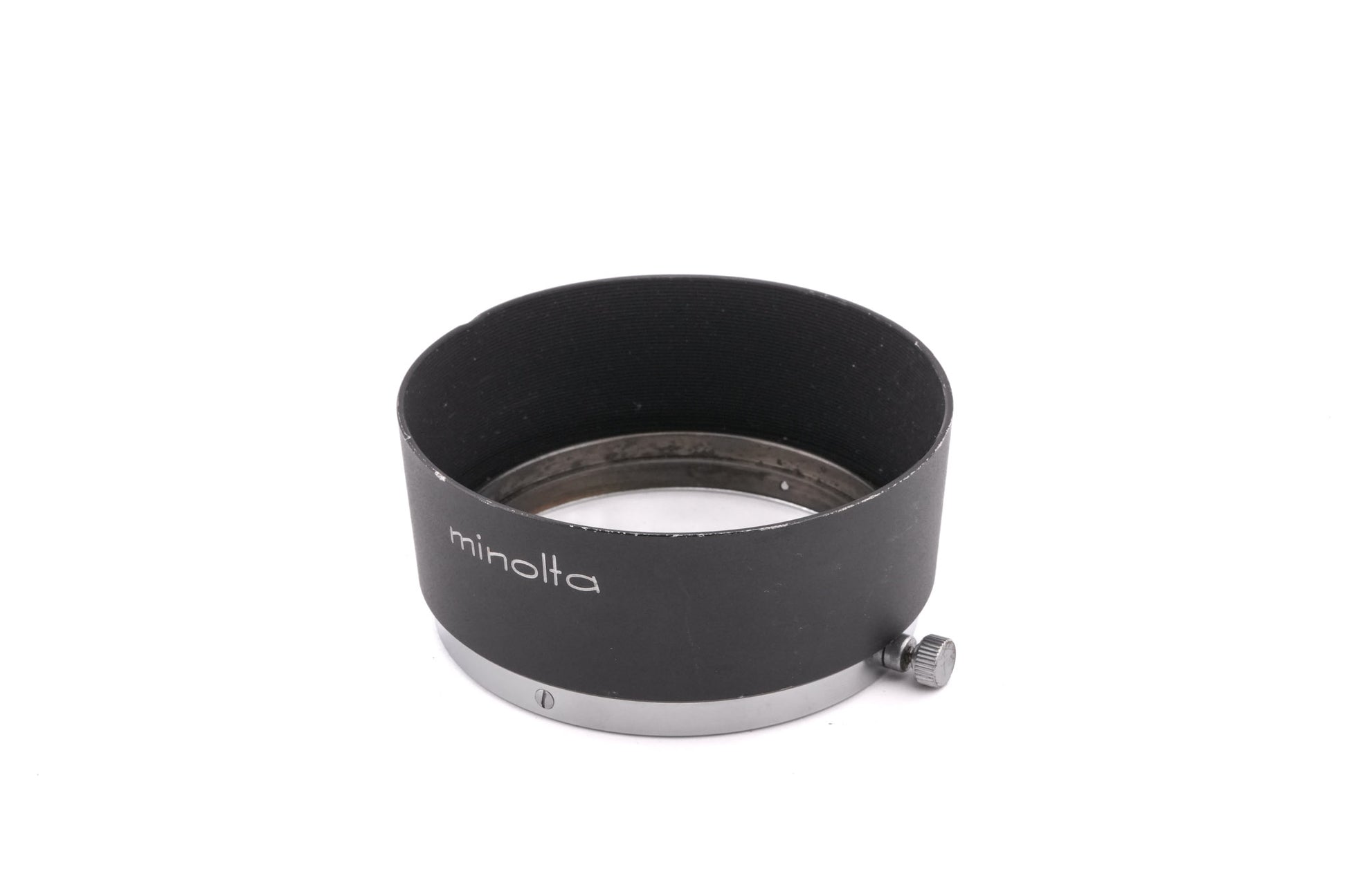 Circular metal lens hood with a 54mm clamp attachment made by Minolta. It is made for the Auto Rokkor-PF 55mm f1.8 lens. Metal body available in black.