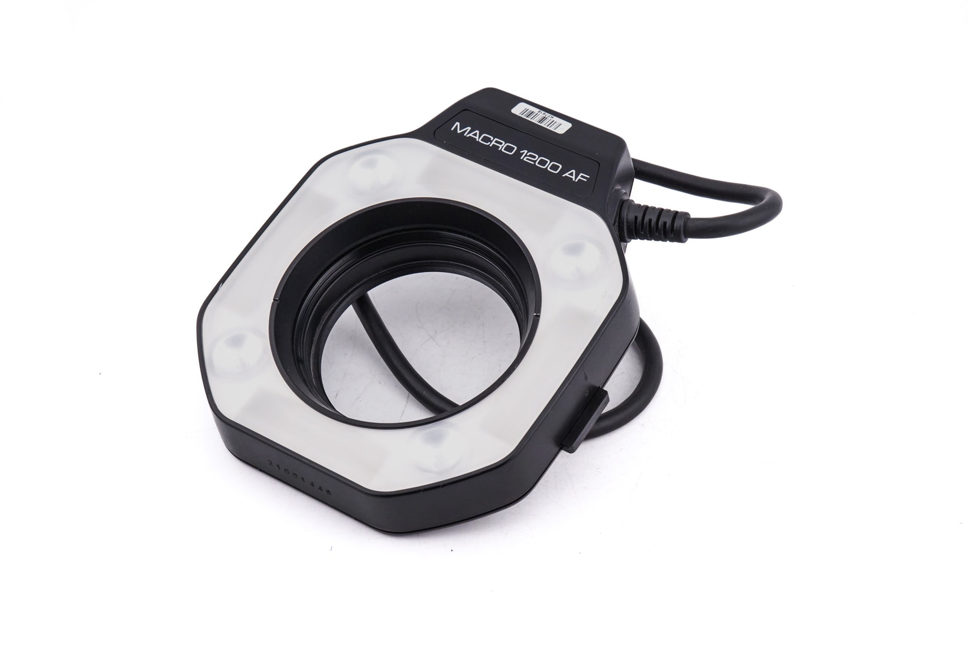 Ring light flash made for AF-mount 35mm SLRs by Minolta. Designed to work with Control Unit 1200 AF. Includes 4 focusing assistance lamps and 4 flash tubes that can be turned on/off individually. Black plastic body.