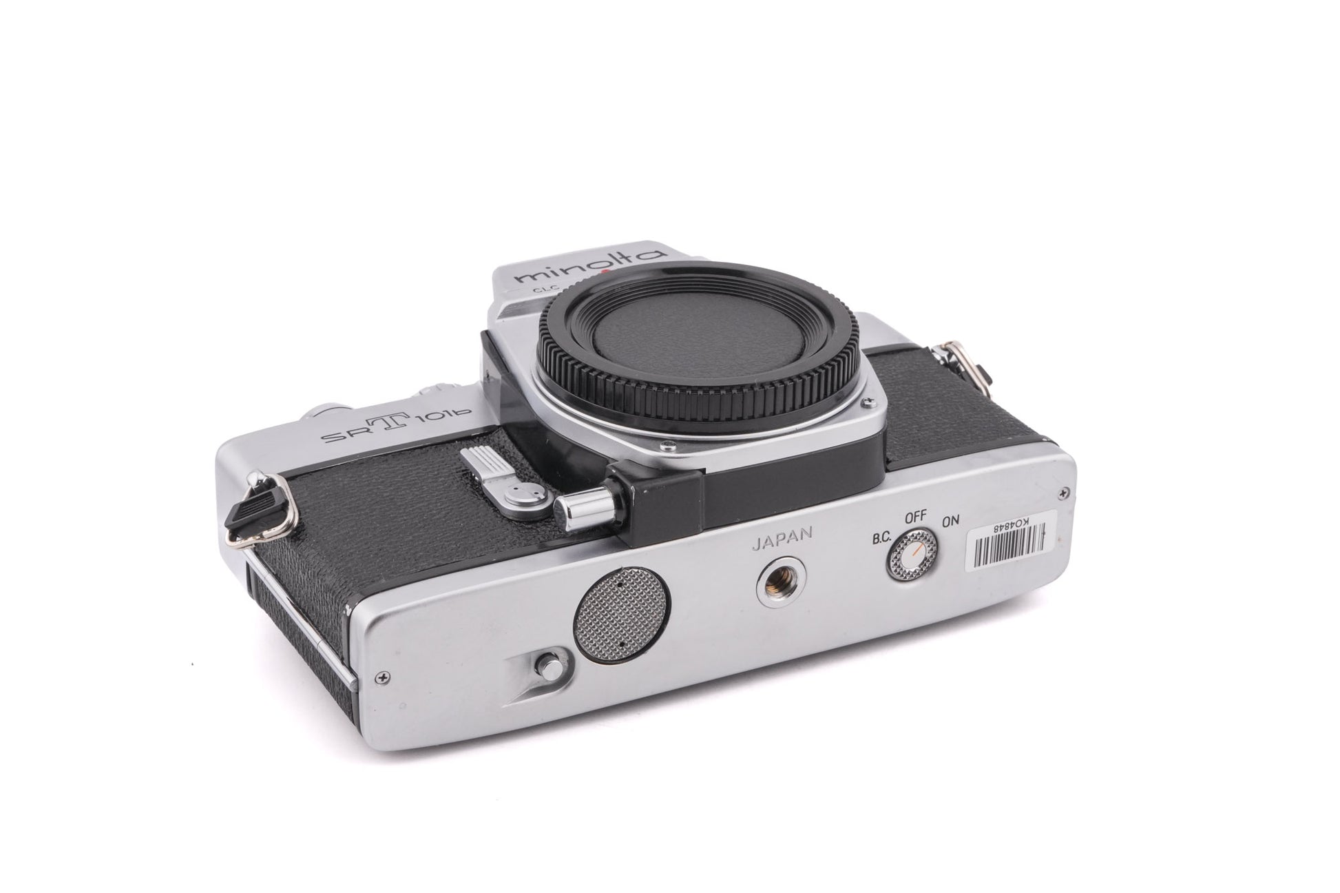 Manual focus Minolta MD mount 35mm SLR released by Minolta in 1966. It uses Minolta's CLC system, an early form of matrix metering that uses two photocells to calculate average exposure. The B model removed the mirror lock-up functionality but added a hot shoe. The camera is also known as the SR-T 201 (NA) and SR 101 (JP). Metal body available in black & silver.