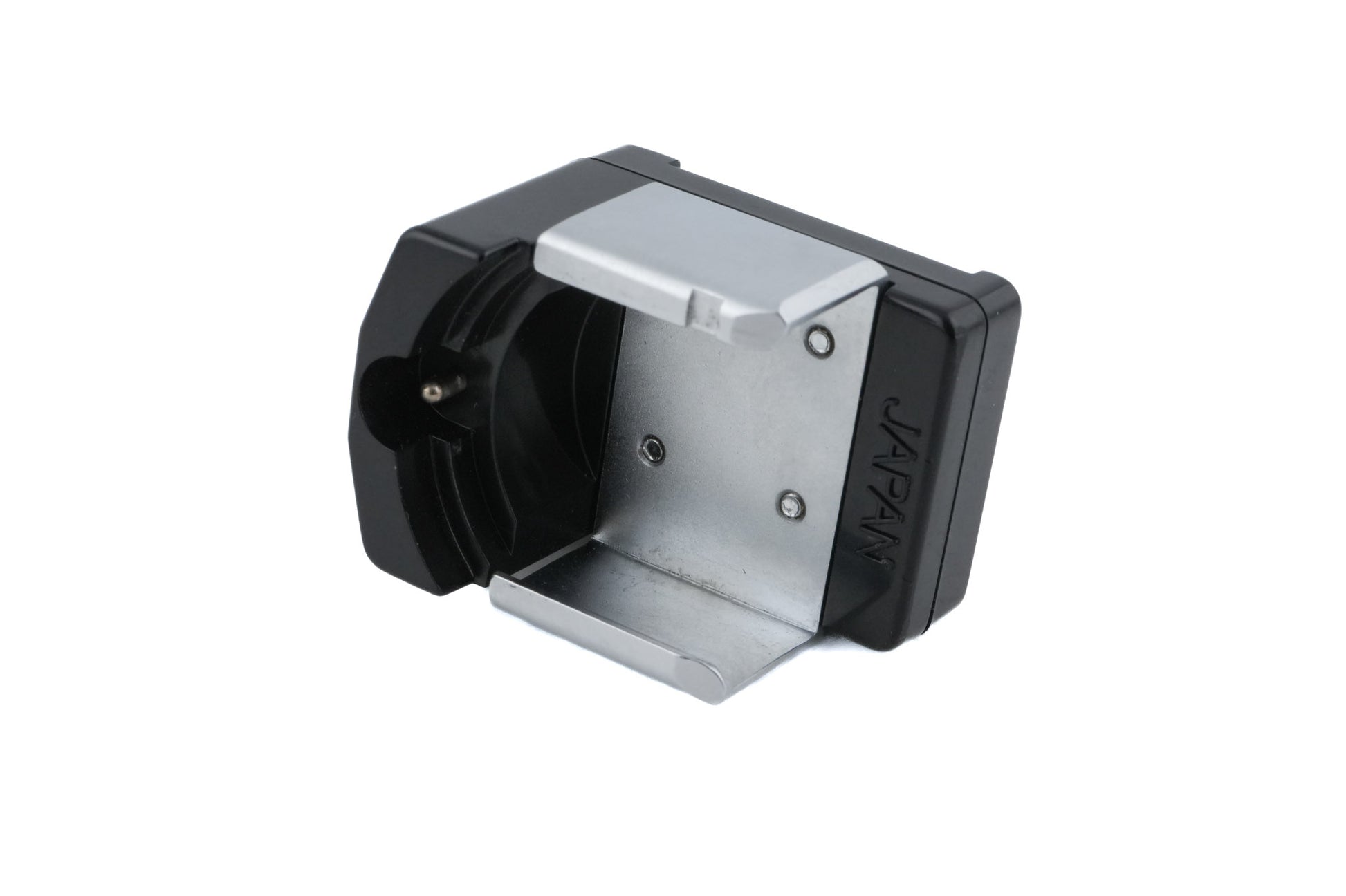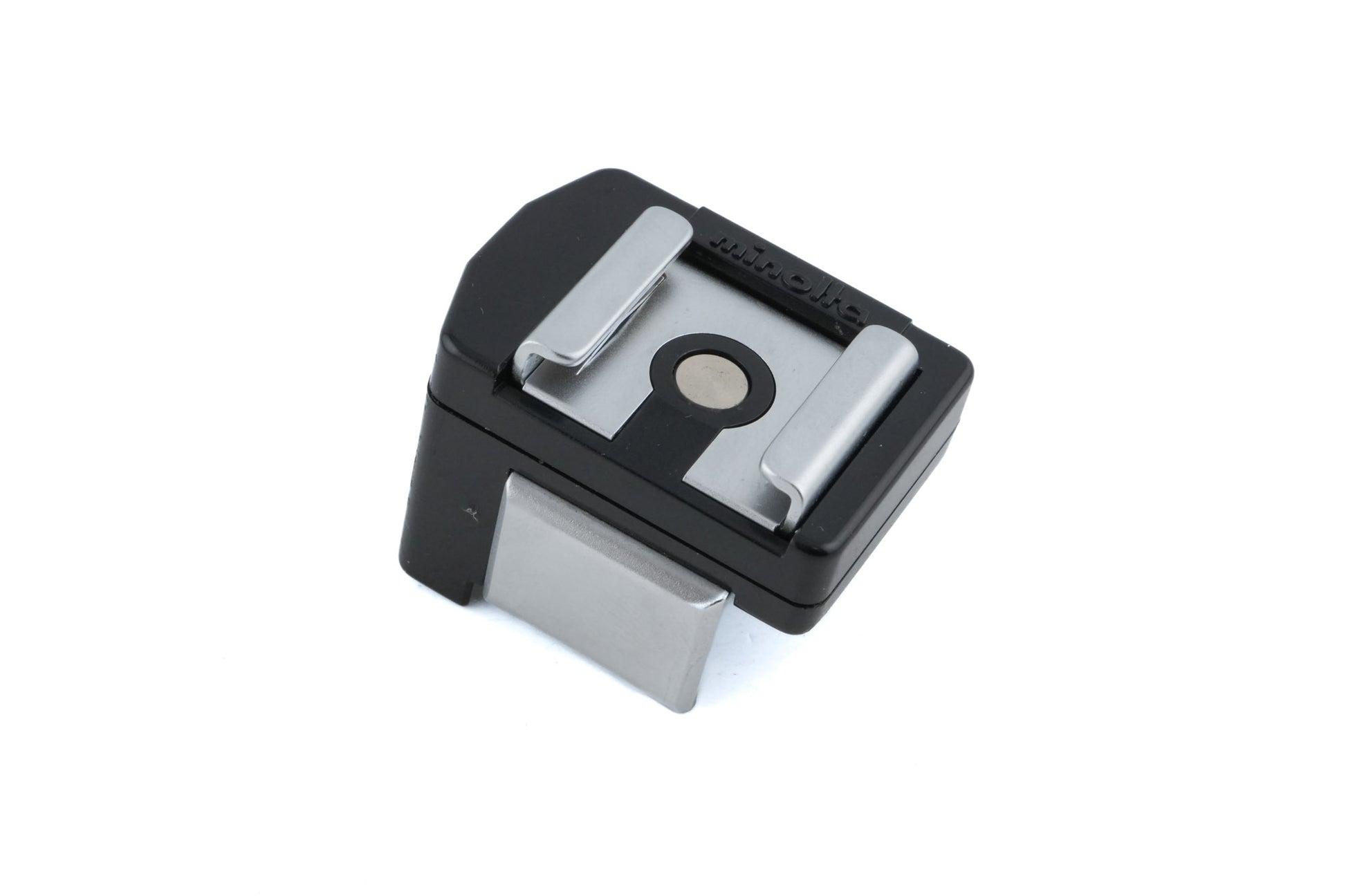 Accessory hot shoe for Minolta XM/XK/X-1 professional system SLR camera. Mounts over the rewind crank of the XM. Plastic and metal construction in black and silver finish.