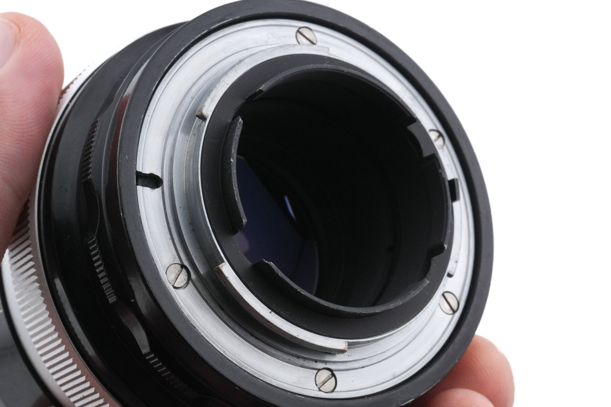 Manual focus telephoto prime lens made for F-mount 35mm SLR cameras by Nikon. This is an early version without the AI ridge, so it will only meter properly on older F and Nikkormat cameras that use the bunny ear metering prongs. Has a built-in lens hood. Metal body available in black & silver.