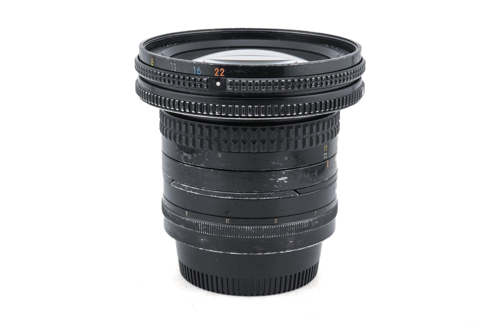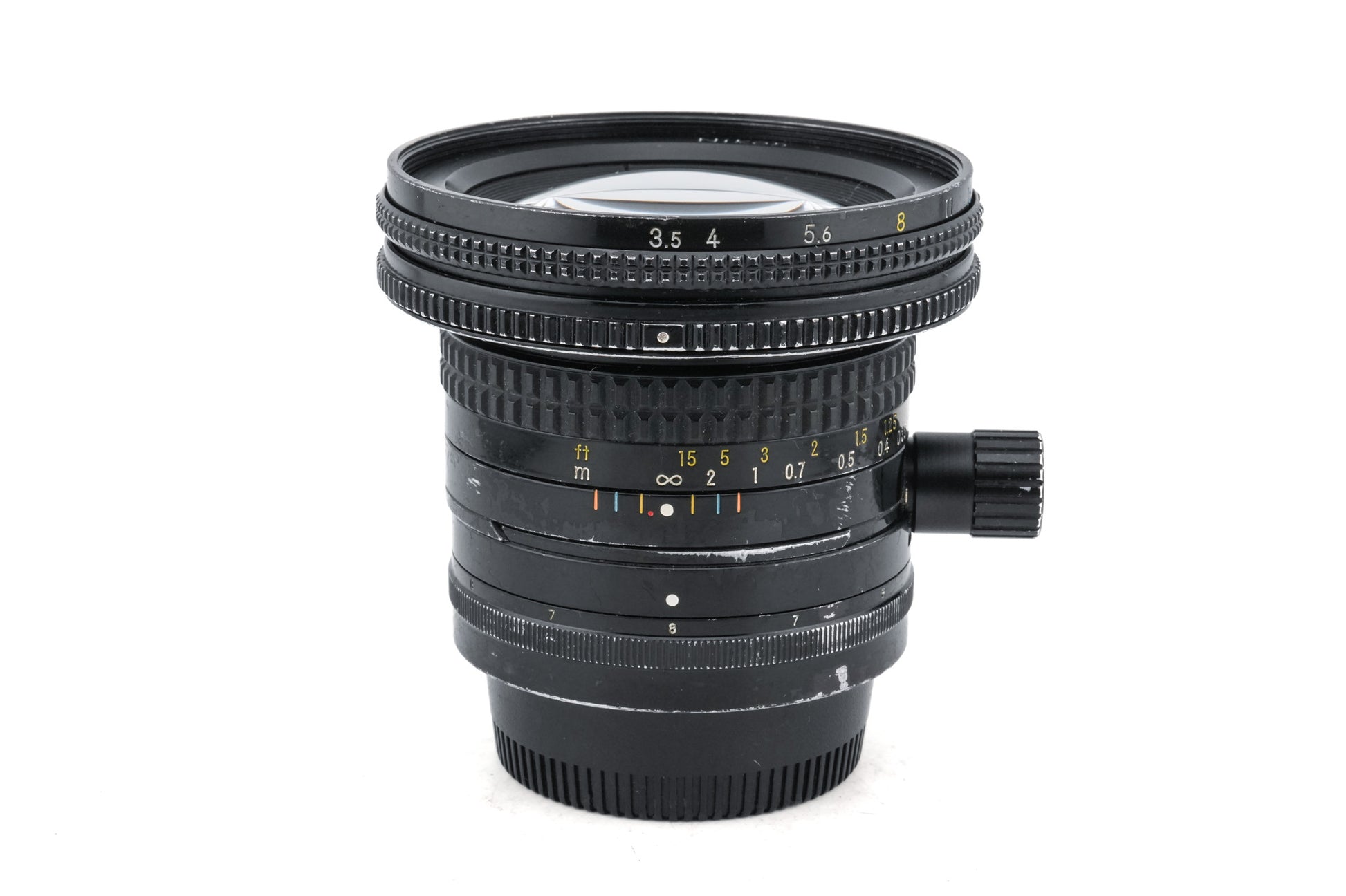 Manual focus wide-angle perspective control (PC) lens made for F-mount SLR cameras by Nikon. It has no aperture connection to the body and thus uses a pre-set aperture system. Metal body available in black.