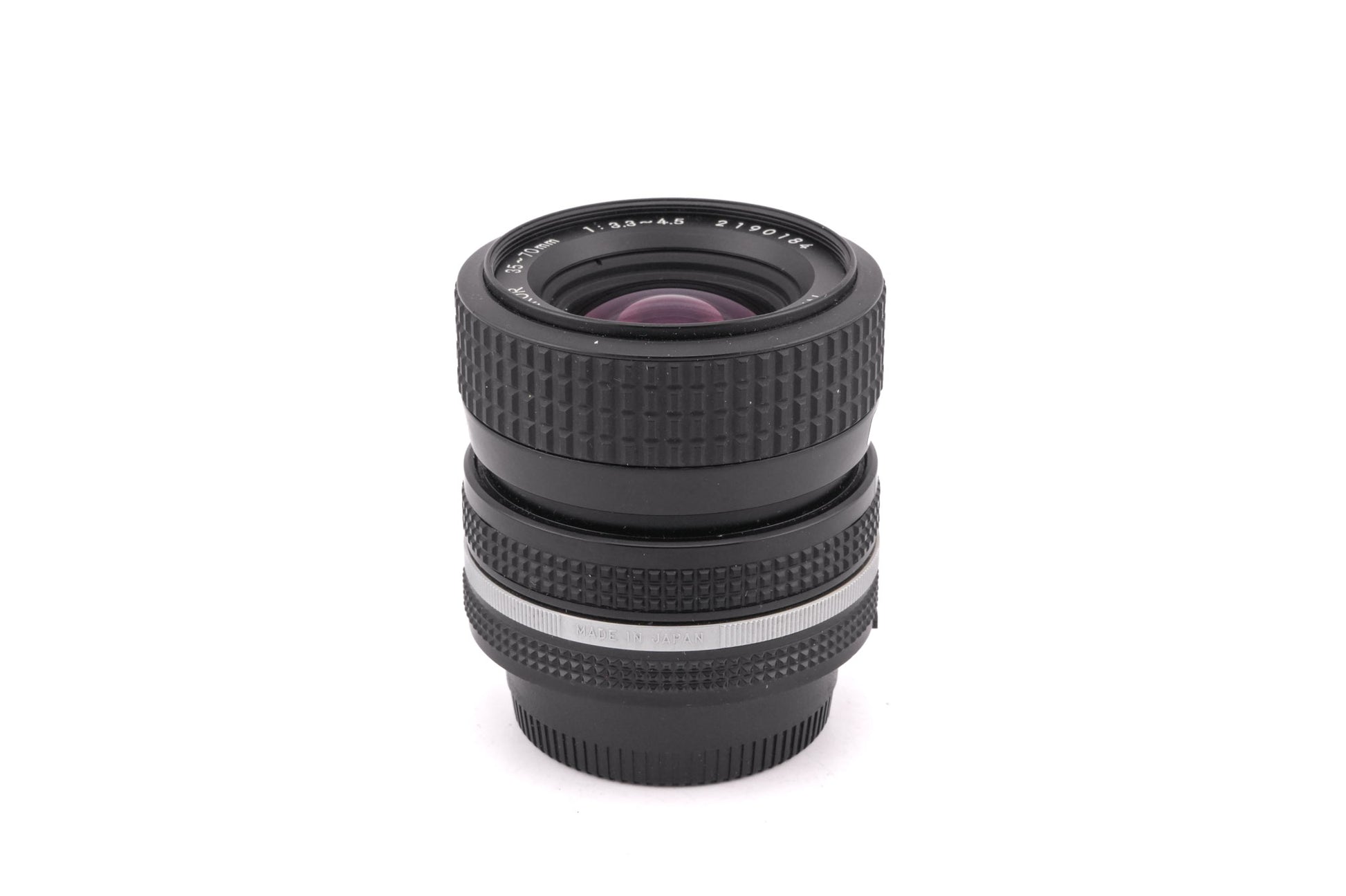 Manual focus zoom lens made for F-mount 35mm SLR cameras introduced by Nikon starting in 1984. It has the bunny ear metering prongs, AI ridge, and AI-S indent so it will meter properly on all manual focus Nikons and can be used with the advanced program modes of later models. Plastic and metal body available in black.