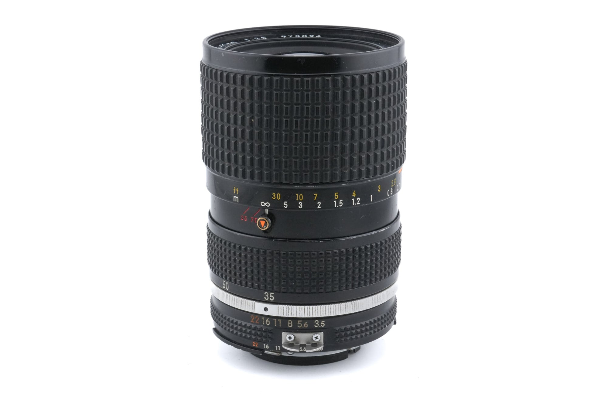Manual focus standard zoom lens made for F-mount 35mm SLR cameras by Nikon introduced in 1981. It was produced until 1987 when it was replaced by the 35-70mm f/2.8 AF (pre-D). It has a macro focus switch. Plastic & metal body available in black.