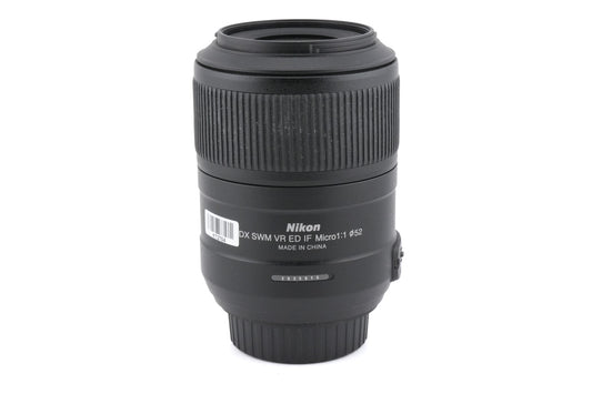 Autofocus short telephoto macro lens made for DX-mount digital SLR cameras by Nikon. It is designed for APS-C-sized sensors and gives the equivalent field of view to a 127.5mm lens on full frame/35mm. It is capable of 1:1 macro reproduction without extension tubes and has built-in image stabilization (VR). Metal and plastic body available in black.