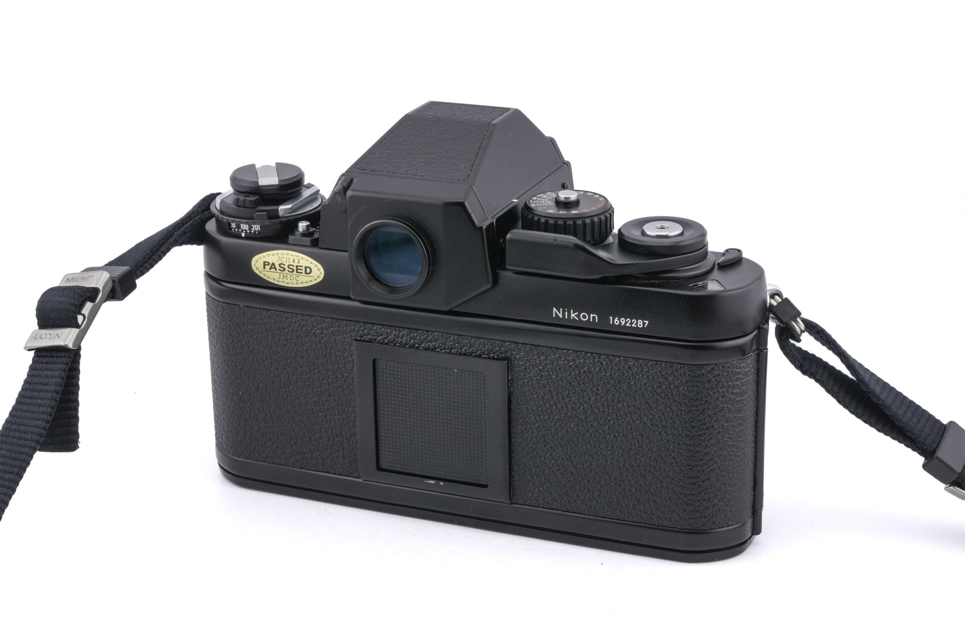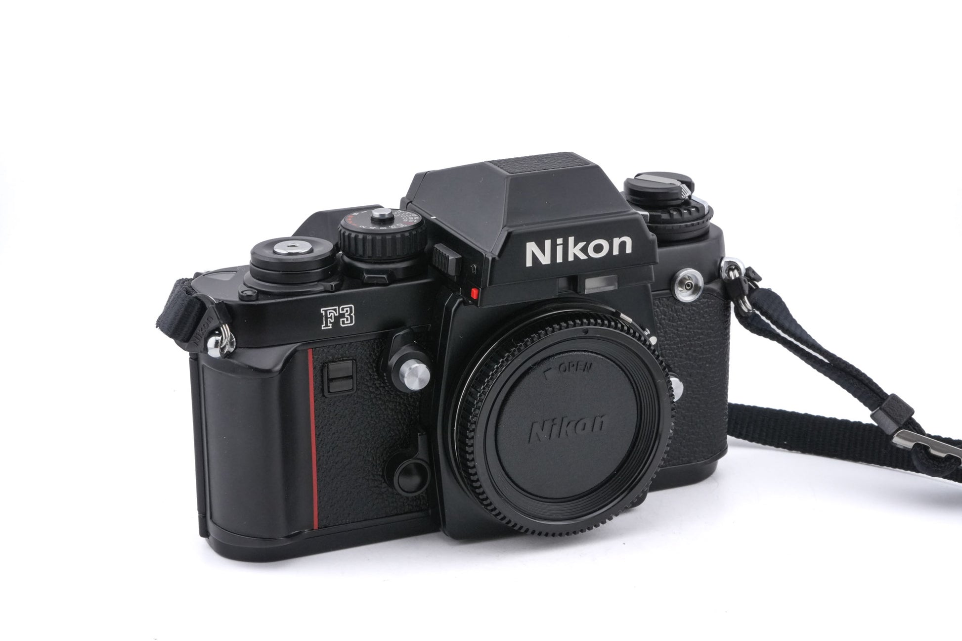 Manual focus F-mount 35mm SLR camera introduced by Nikon in 1980. It was the first professional Nikon SLR to feature an electronically controlled shutter but featured the same amount of customizable prisms, grips, and focusing screens as previous models. It was also the first of numerous Nikon F-series cameras to be styled by Italian designer Giorgetto Giugiaro and include a red stripe on the handgrip. This model is an F3 body with a DE-2 standard eye-level finder. Metal body available in black.
