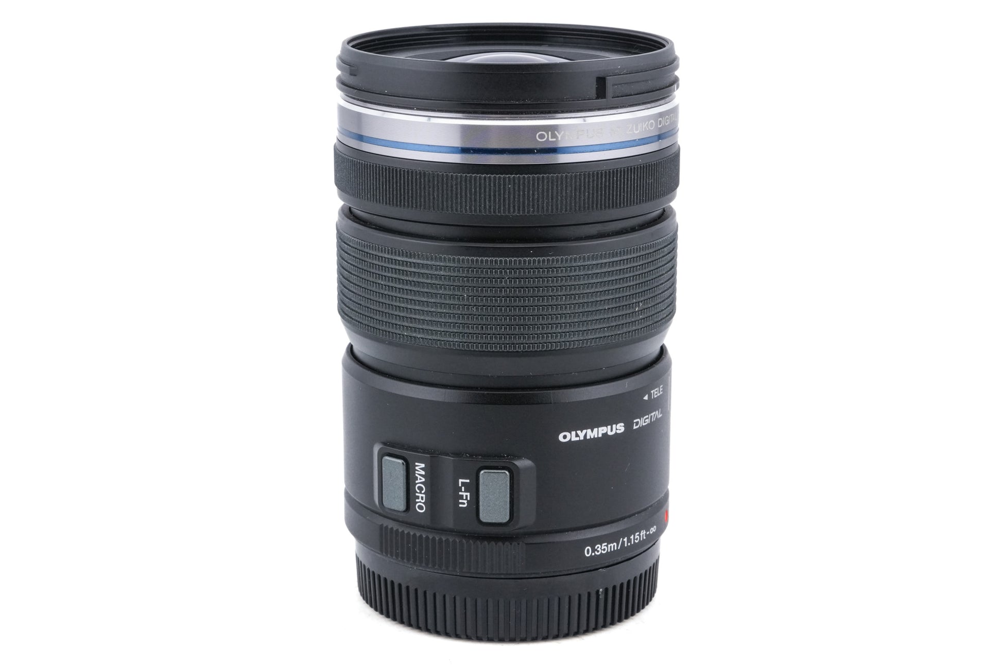 Autofocus zoom lens made for Micro Four Thirds mount mirrorless cameras by Olympus. It has a clutch for manual zoom, electronic power zoom, and macro mode. It also has a lens function button. Plastic body available in black or silver.