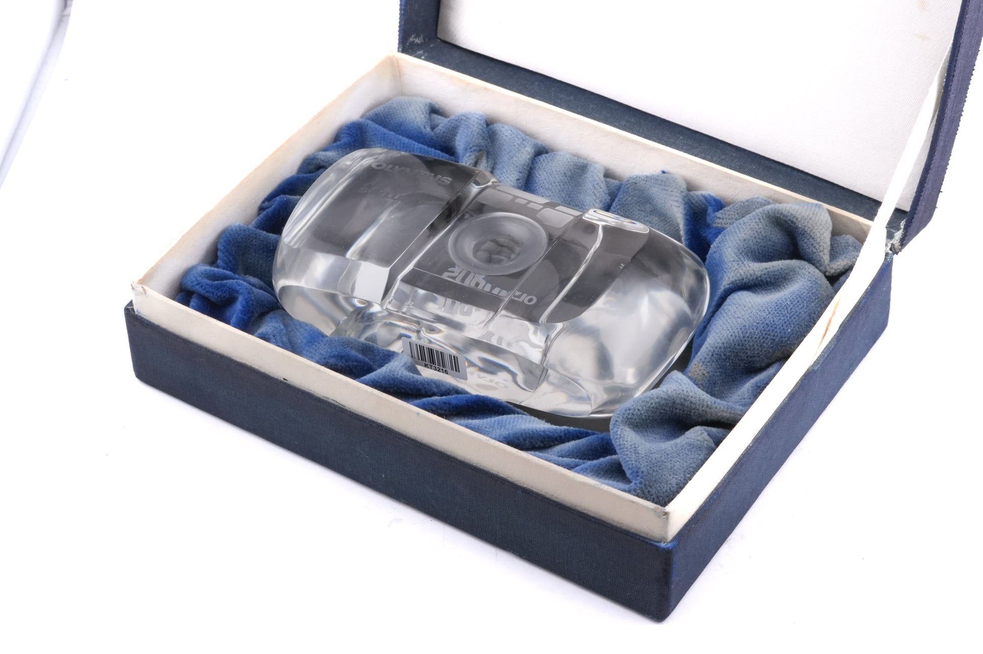 Paperweight made by Olympus. It's in the shape of an Olympus Mju-1. Clear glass/crystal body.