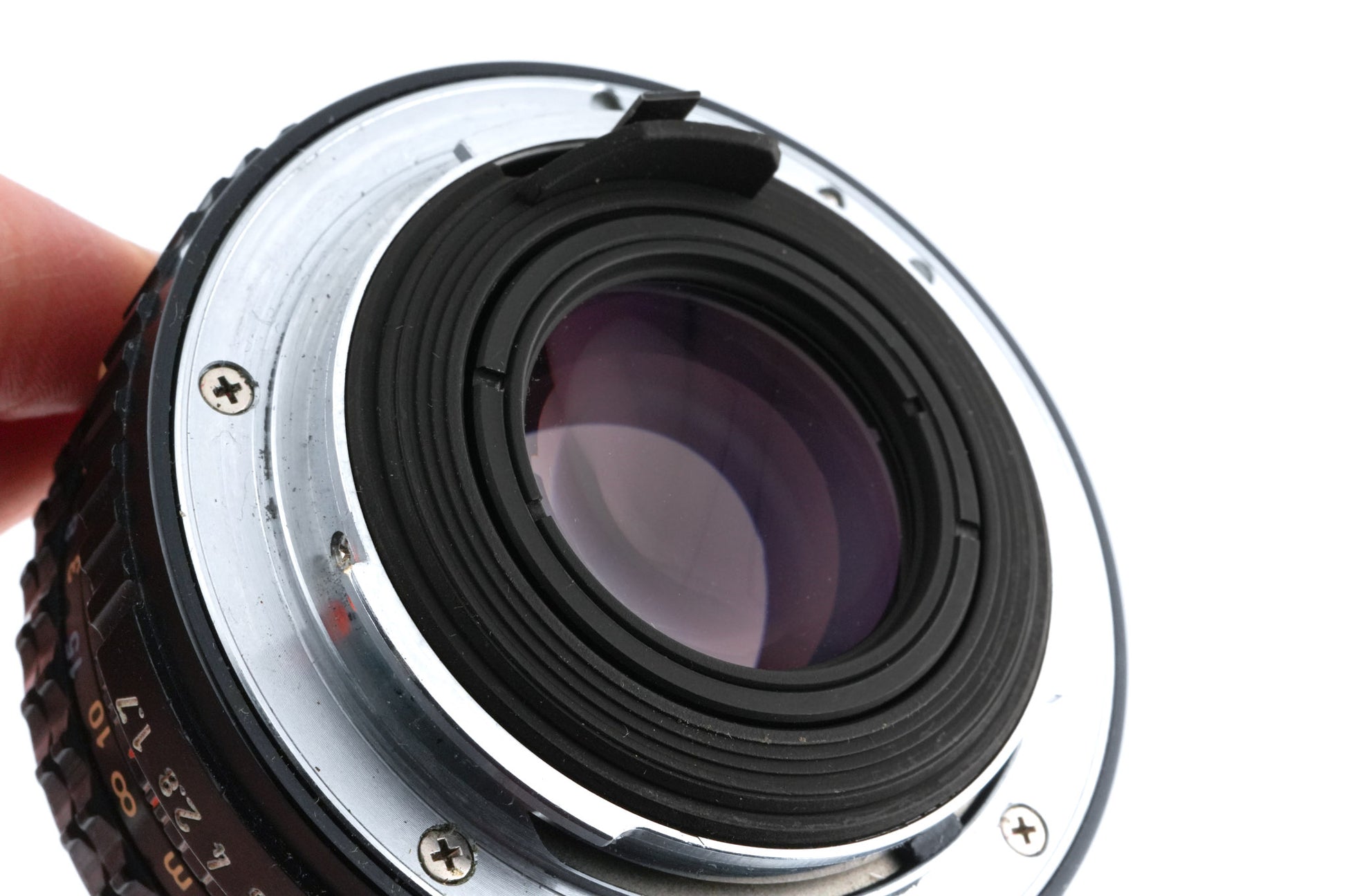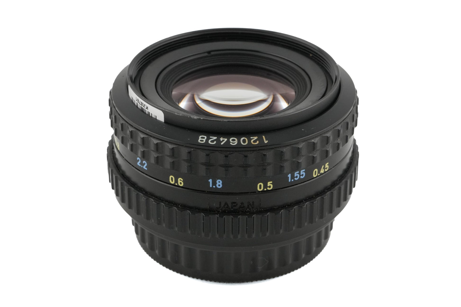 Manual focus normal lens made for K-mount SLRs by Pentax. This Pentax-A model works with advanced auto exposure modes of later manual focus Pentax film cameras. Metal and plastic body available in black.