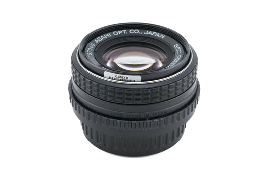 Manual focus normal lens made for K-mount 35mm SLR cameras by Pentax. It does not work with the automatic modes of later Pentax models. Plastic/metal body available in black.